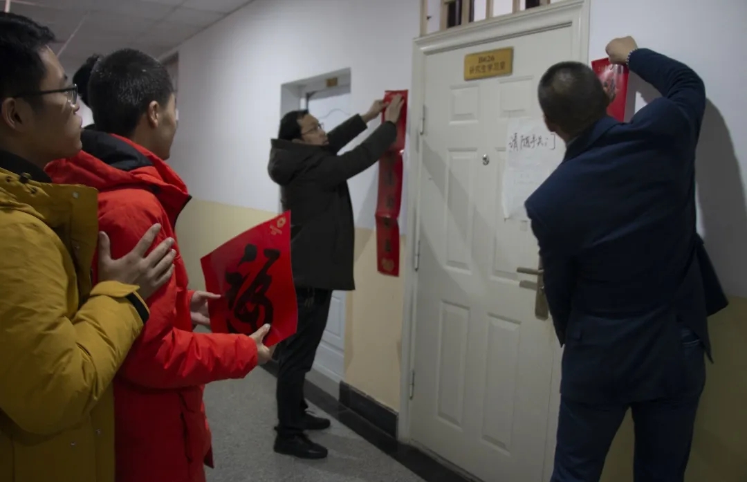 学院领导协同学生一起张贴春联,节日气氛异常浓厚,此外,不忘特别叮嘱同学们记得给父母打电话,送上新春的祝福。