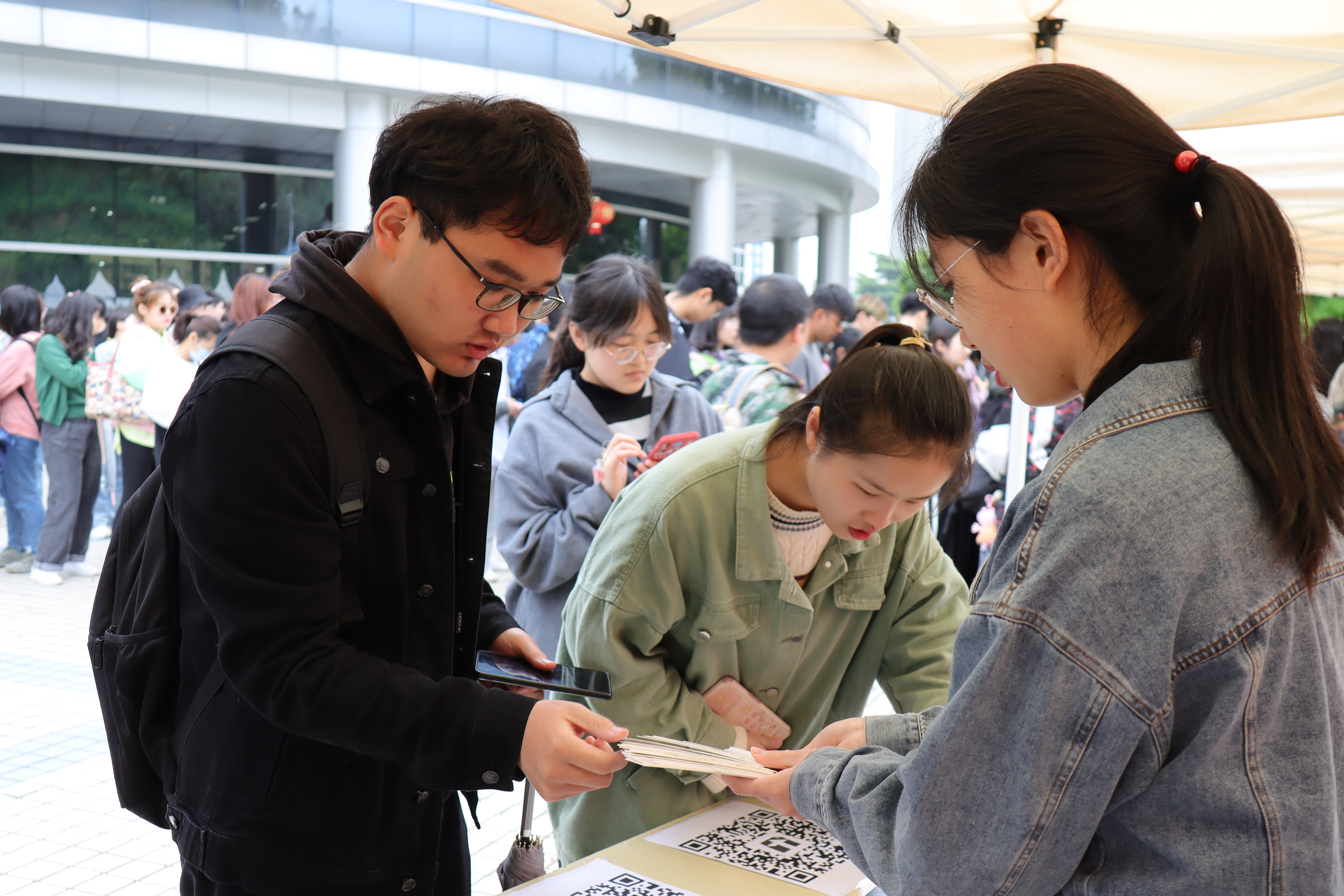 安全月知识竞赛活动分为两个环节。第一环节,参赛学生首先在相应的QQ群里获取安全教育相关的知识和信息,在赛前做好充分准备。第二环节,参赛学生于指定时间在润泽园广场参加现场竞赛活动。竞赛现场,同学们有序地排起长队,在等候的同时纷纷用手机复习着安全知识。最终,不少同学快速回答出了正确答案并获得了精美的奖品。
