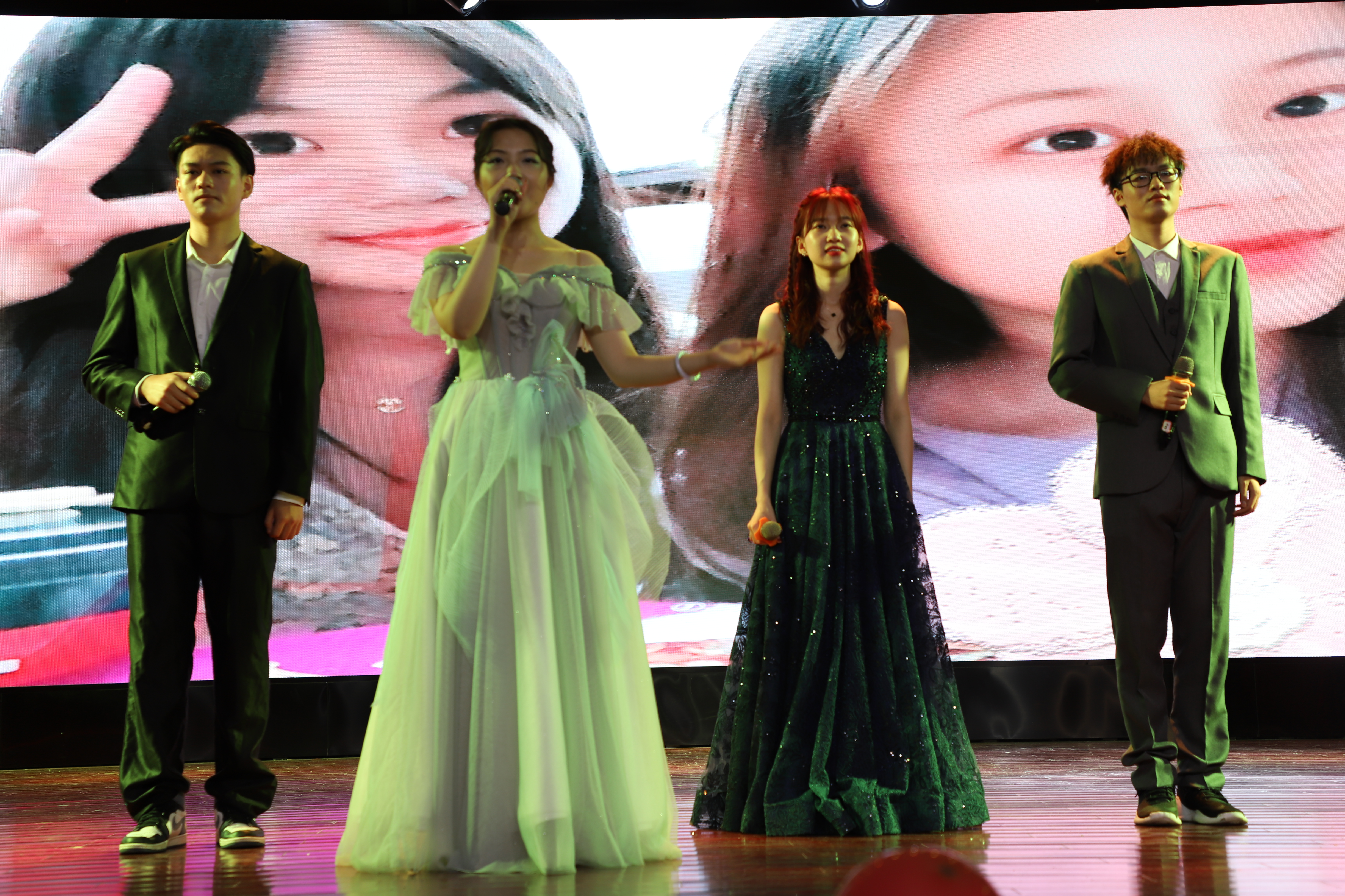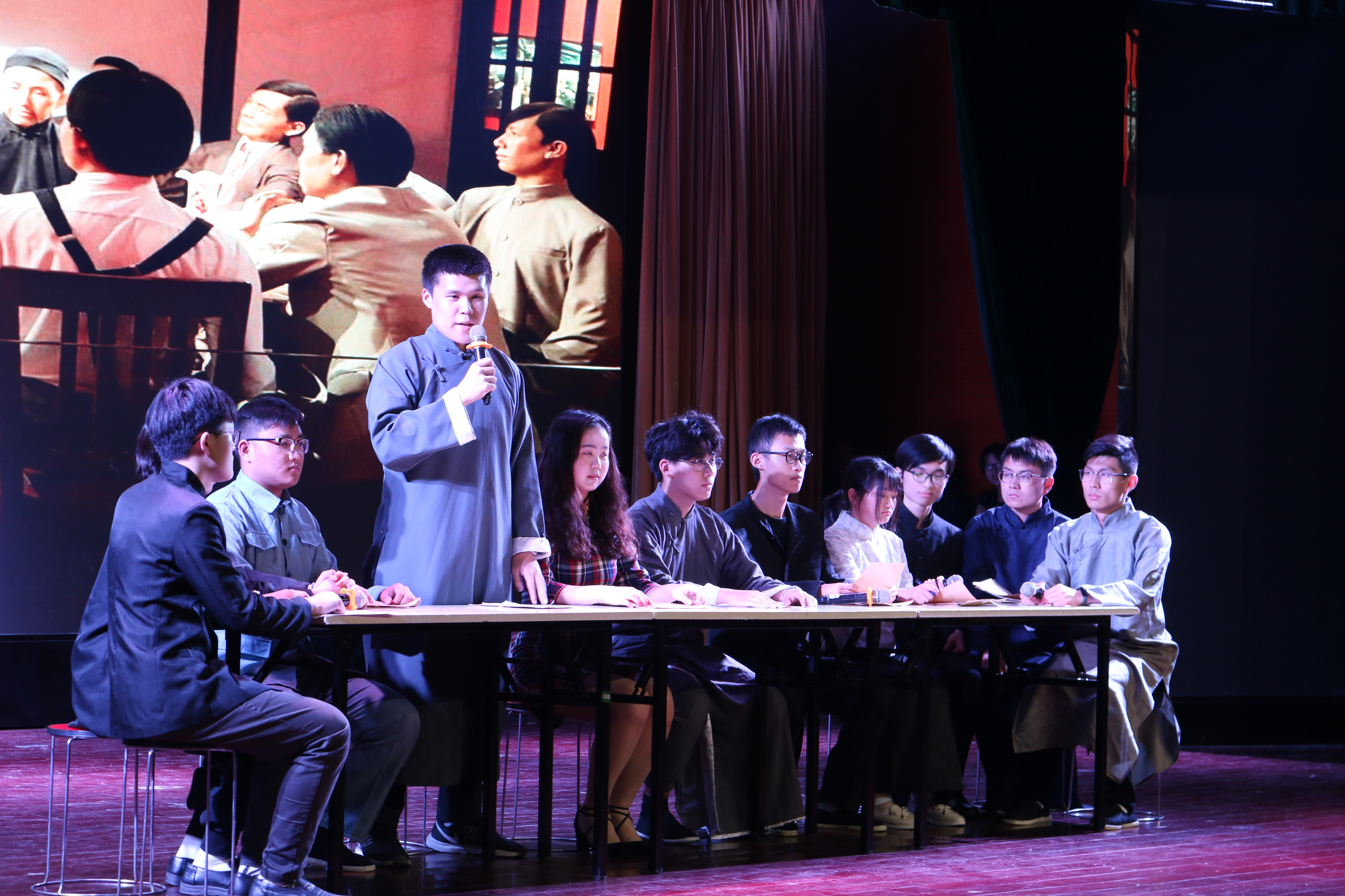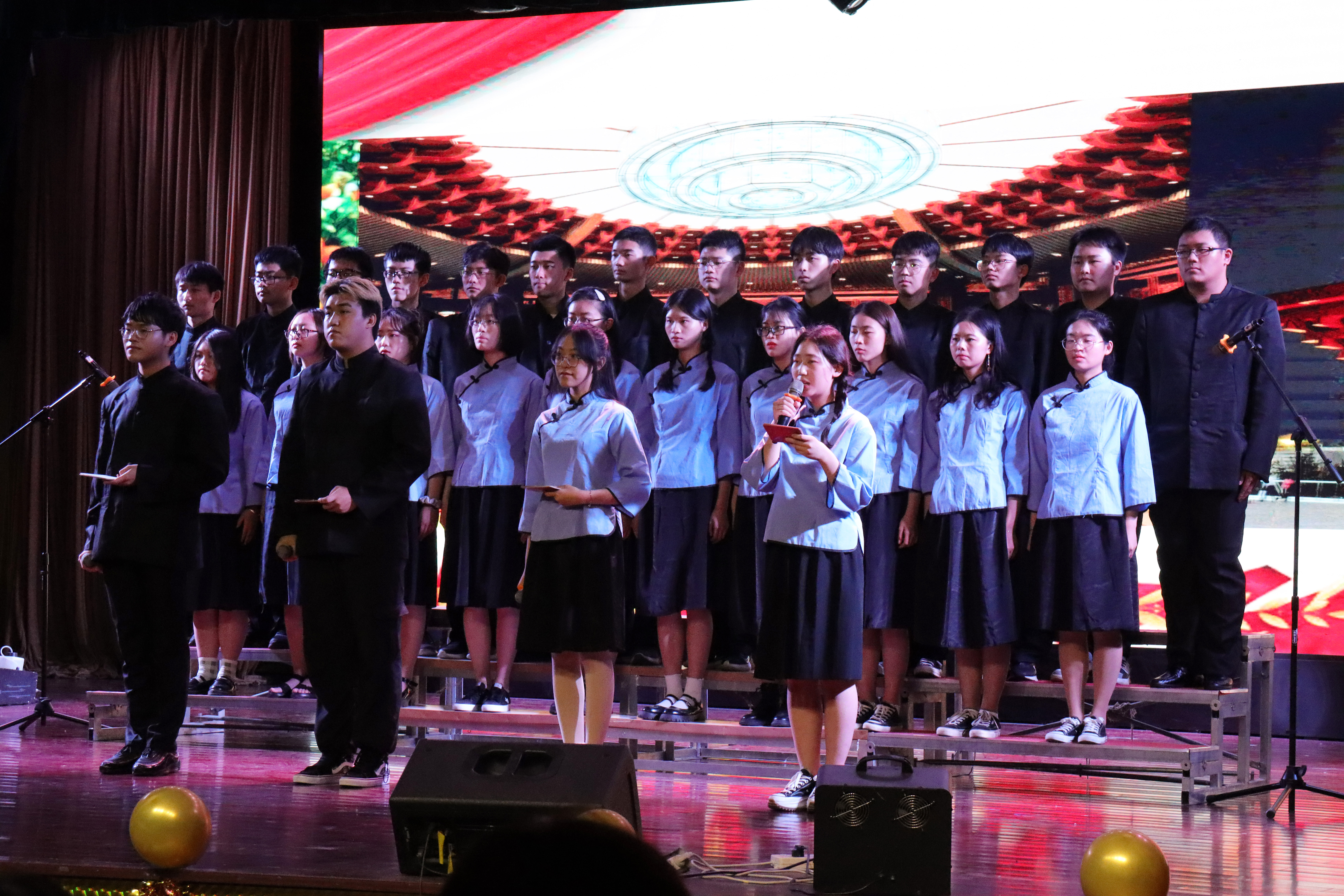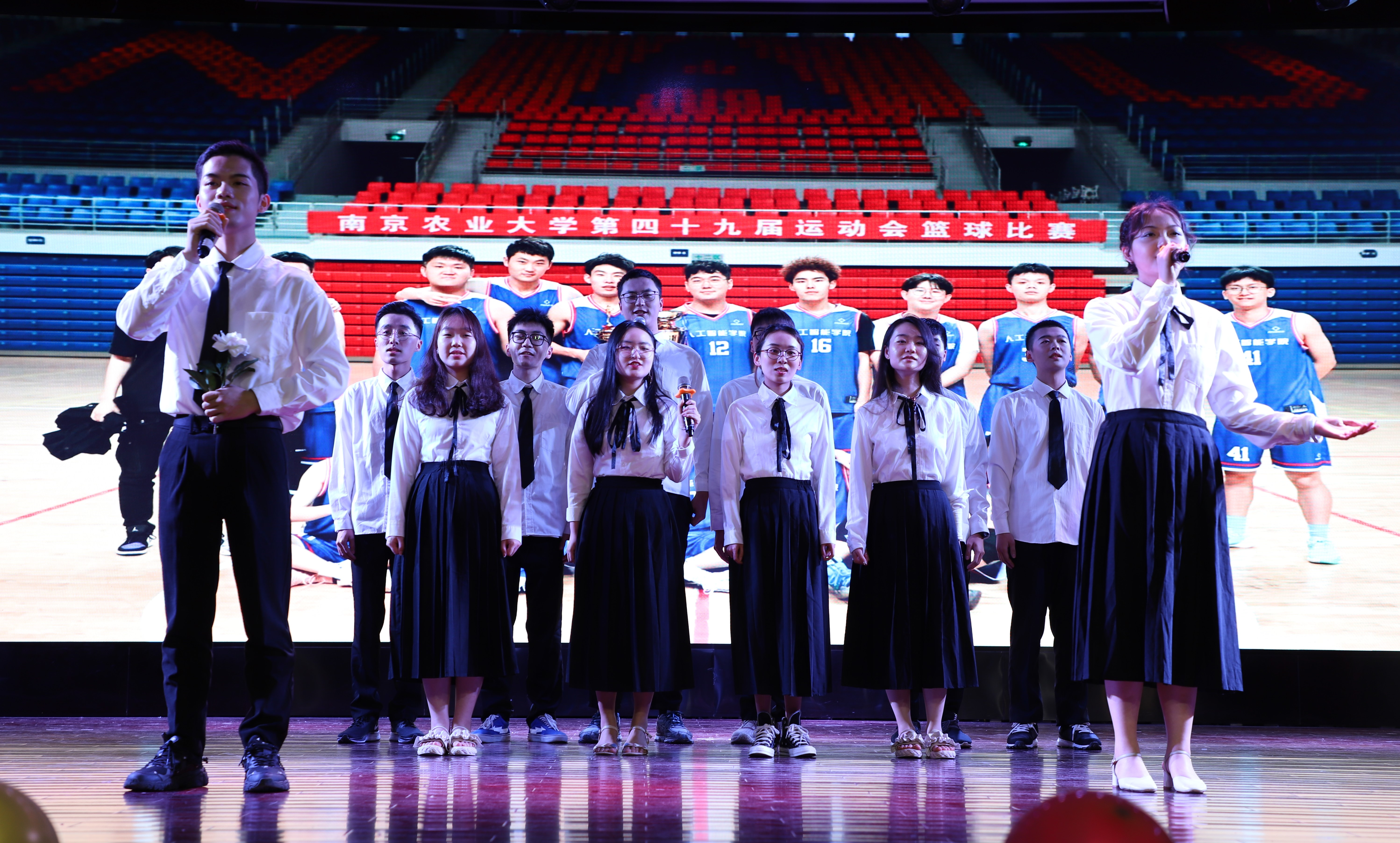 第一篇章“红旗飘飘党心聚”。晚会在电子信息类2009/10班带来的合唱《少年中国说》中拉开了序幕。学生将铿锵有力的歌唱与招式齐全的军体拳相结合,形式新颖,震撼力强。随后,人工智能201班演绎小品《穿越百年的工人光辉》,带我们再一次感受了工人阶级的强大。自动191/2班紧抓当下热点,用舞台剧的方式上演了《觉醒年代》。演员们对角色有深入的思考,现场表现力强,中英文流畅的表演引来阵阵掌声。同时,为激励全体同学全面发展,第一篇章的最后进行了“AI之星”的颁奖仪式,希望他们能再接再厉,以高度的责任感和强烈的使命感,为建设农业特色世界一流大学贡献自己的青春力量。