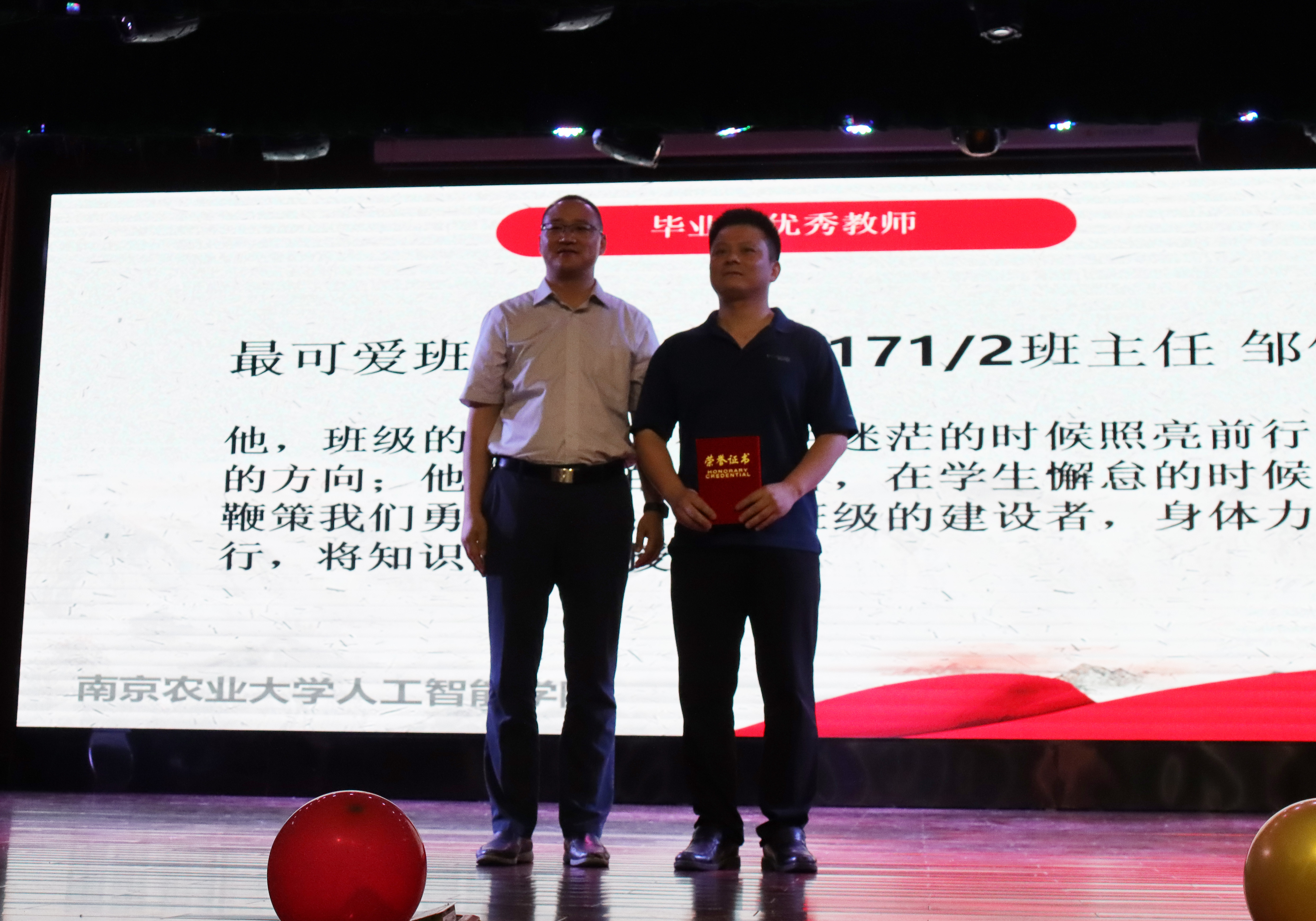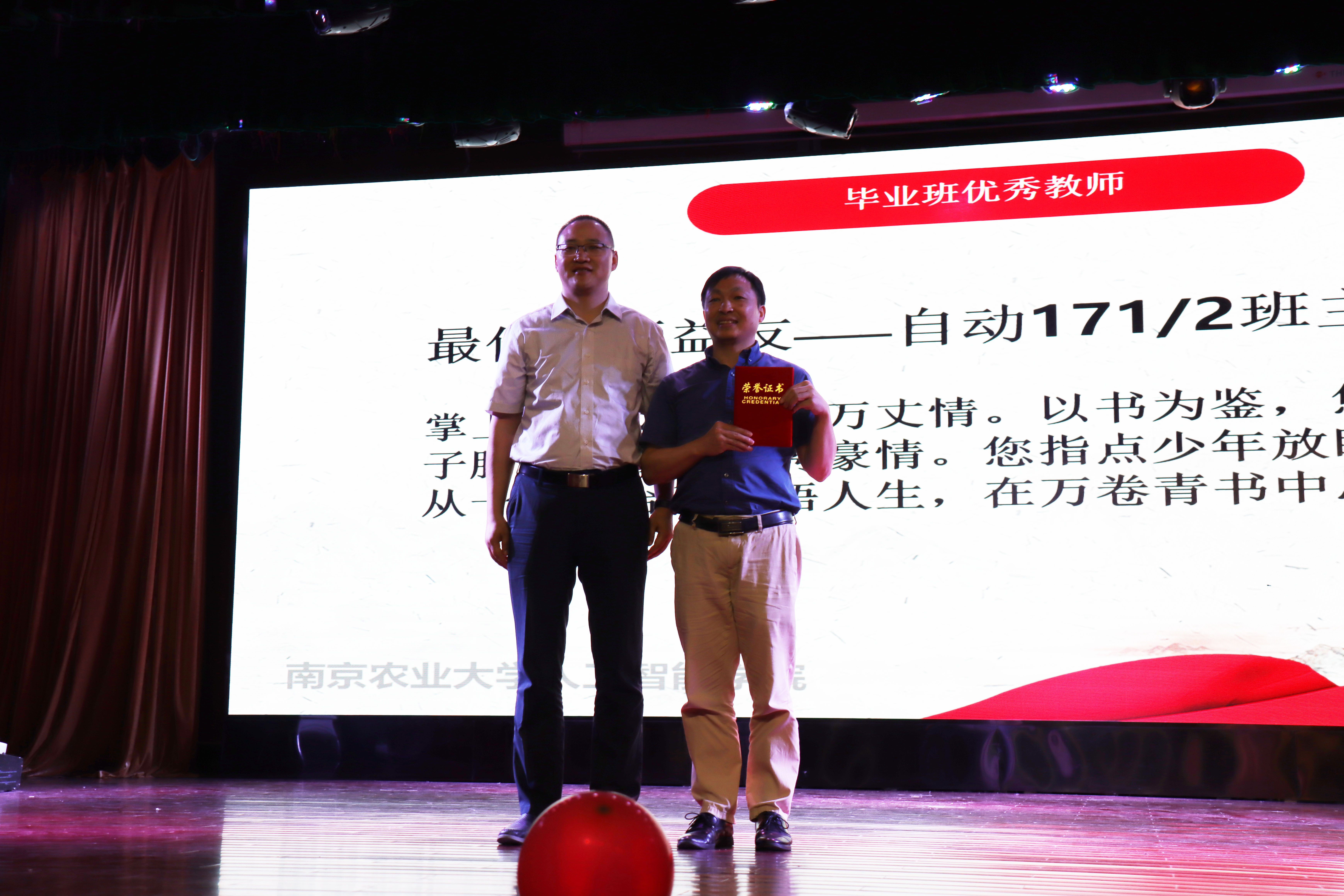成长的道路上少不了老师们的谆谆教诲,为感恩每一位班主任的辛勤付出,毕业生班级自发组织,为班主任撰写颁奖词,表达对班主任四年陪伴与教育的感谢。四位班主任分别获得了“最佳良师益友”、“最佳师德标兵”、“最可爱班主任”及“最牛教师”的称号。并由卢伟为毕业生班主任进行了颁奖。