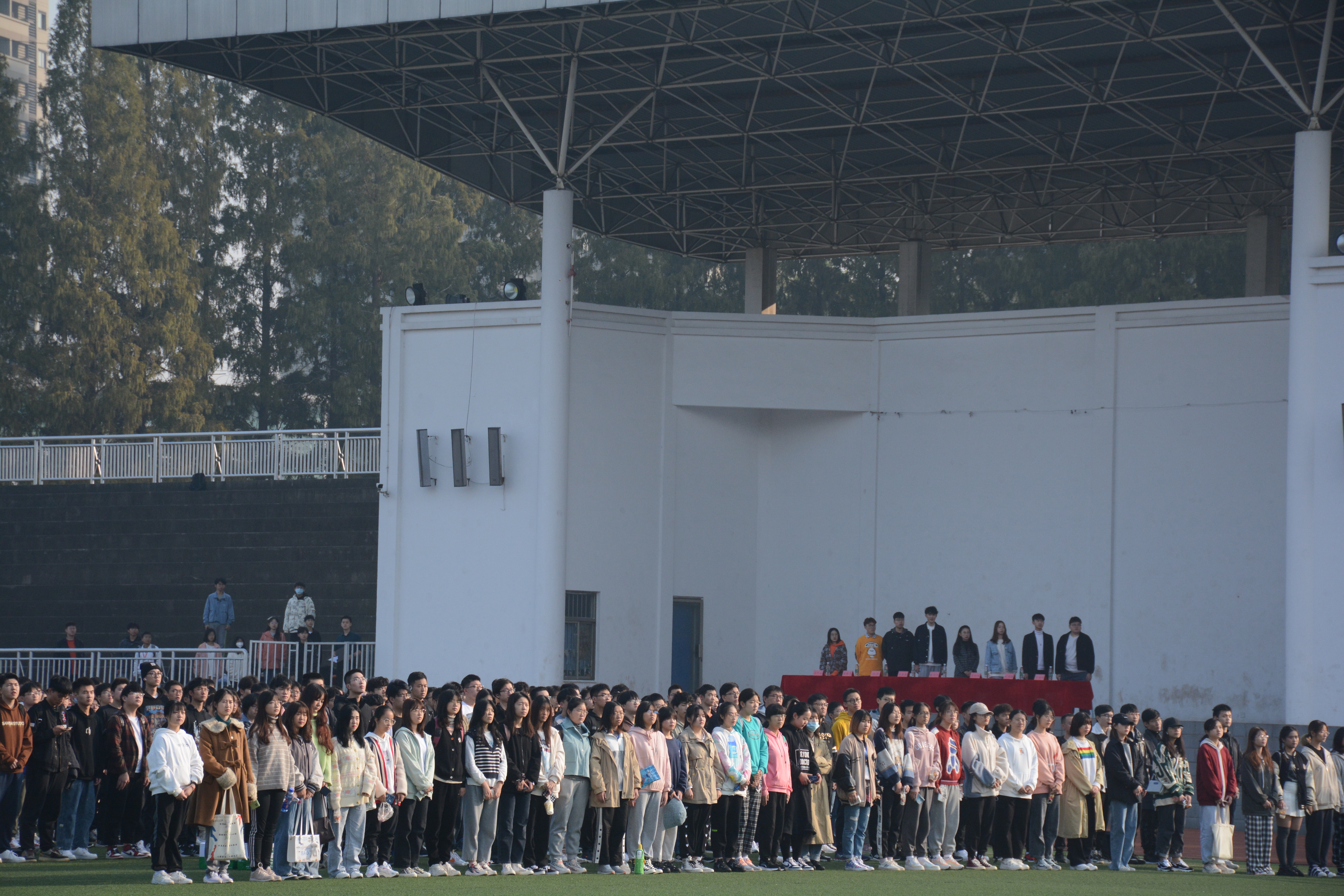 升旗仪式开始,激昂的国歌响彻整个运动场,仪仗队迈着坚定的步伐缓缓走来。随后,裁判员代表李胜宇、运动员代表辛健鹏分别进行庄严宣誓。开幕式最后,魏宇宁上台讲话,对本次运动会寄予美好愿景,并宣布运动会正式开始。