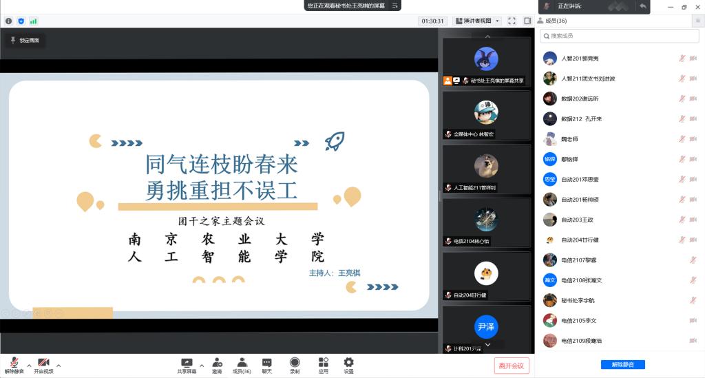 会议共分为四部分:线上工作学习、防疫管理经验分享;线上学习工作中的问题与解答;学生组织近期工作安排;《习近平与大学生朋友们》选段集中学习。会议开始,首先由各班委就线上工作学习和疫情管理方面进行了经验分享。分享结束,对于一些班级提出的问题,各班委根据自身理解以及平日的经历经验进行答疑,给予可实践方法。针对大家的共性问题,魏宇宁对所提出的问题进行解答,并提供多种解决方案。同时,魏宇宁就怎么做好学生工作从多个方面进行了分享,包括如何分类管理班级成员,建立适合当下的班级管理制度等,并积极动员班委组织线上班级活动。最后团干部集中学习了《习近平与大学生朋友们》选段。至此,本次会议圆满结束。