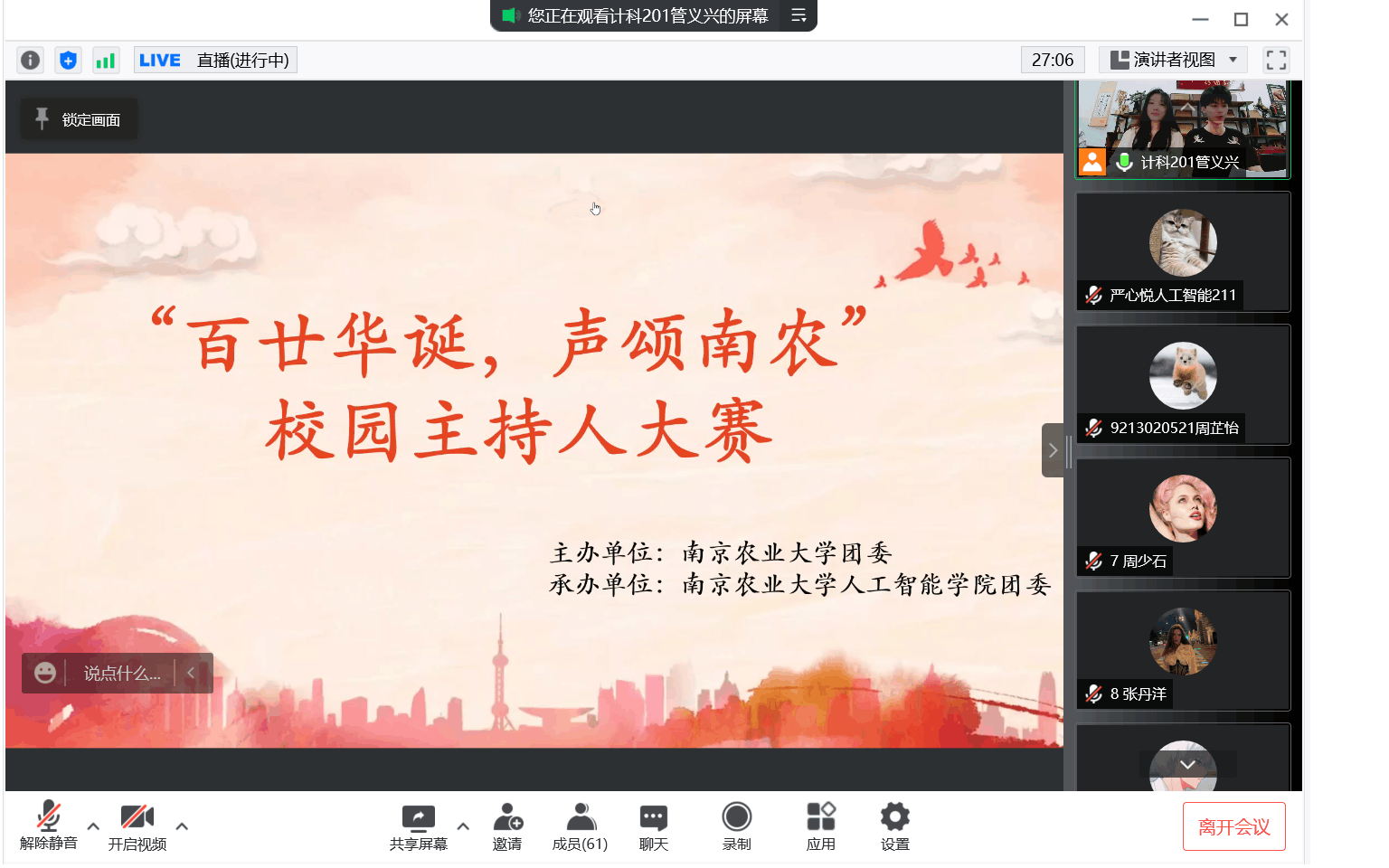 团委承办的“百廿华诞,声颂南农”校园主持人大赛复赛在线上举行。党委组织部组织员何旭、发展规划与学科建设处发展规划科长辛闻、公共艺术教育中心干事孟宁馨担任评委。