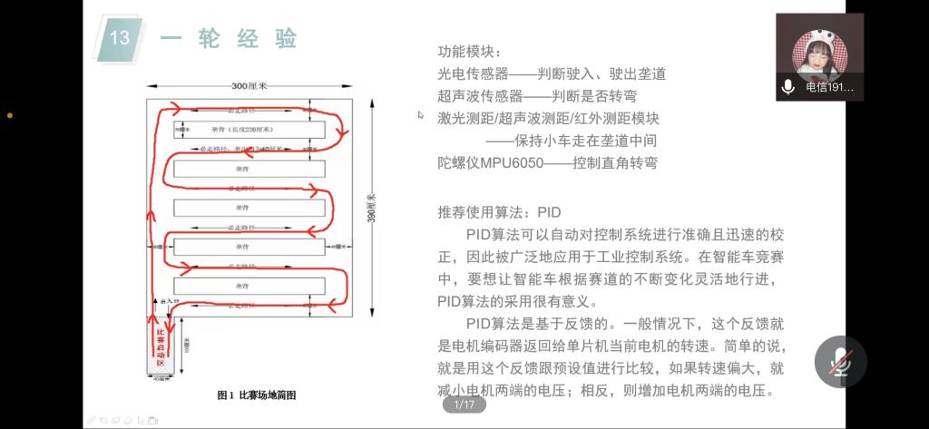 本次宣讲会邀请了往届比赛选手——电信191班王琬婷和电信193班杨岸松,王琬婷从比赛规则、准备方法、比赛经验三个维度细致全面地介绍了往年B类比赛以及赛道,分享参赛经验,讲解在各类不同比赛要求下应如何变通,合理应用小车完成任务。之后由杨岸松讲解A、C类比赛以及近年新增的D类比赛的要求、规则以及参加条件,展示了往届选手在国赛的精彩瞬间和萝莉岛