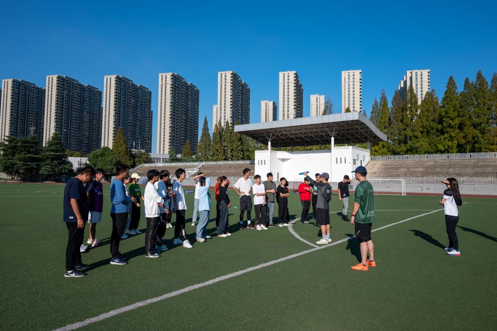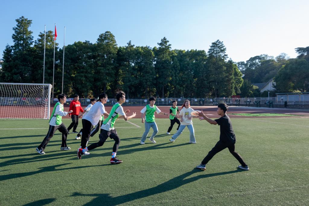 此外,运动会惊喜加入了近期非常流行的飞盘比赛项目,学院邀请到校外专业飞盘教练给学生进行培训并组织了一场表演赛。参与学生在操场上挥洒汗水、绽放笑容,比赛氛围瞬间达到高潮。