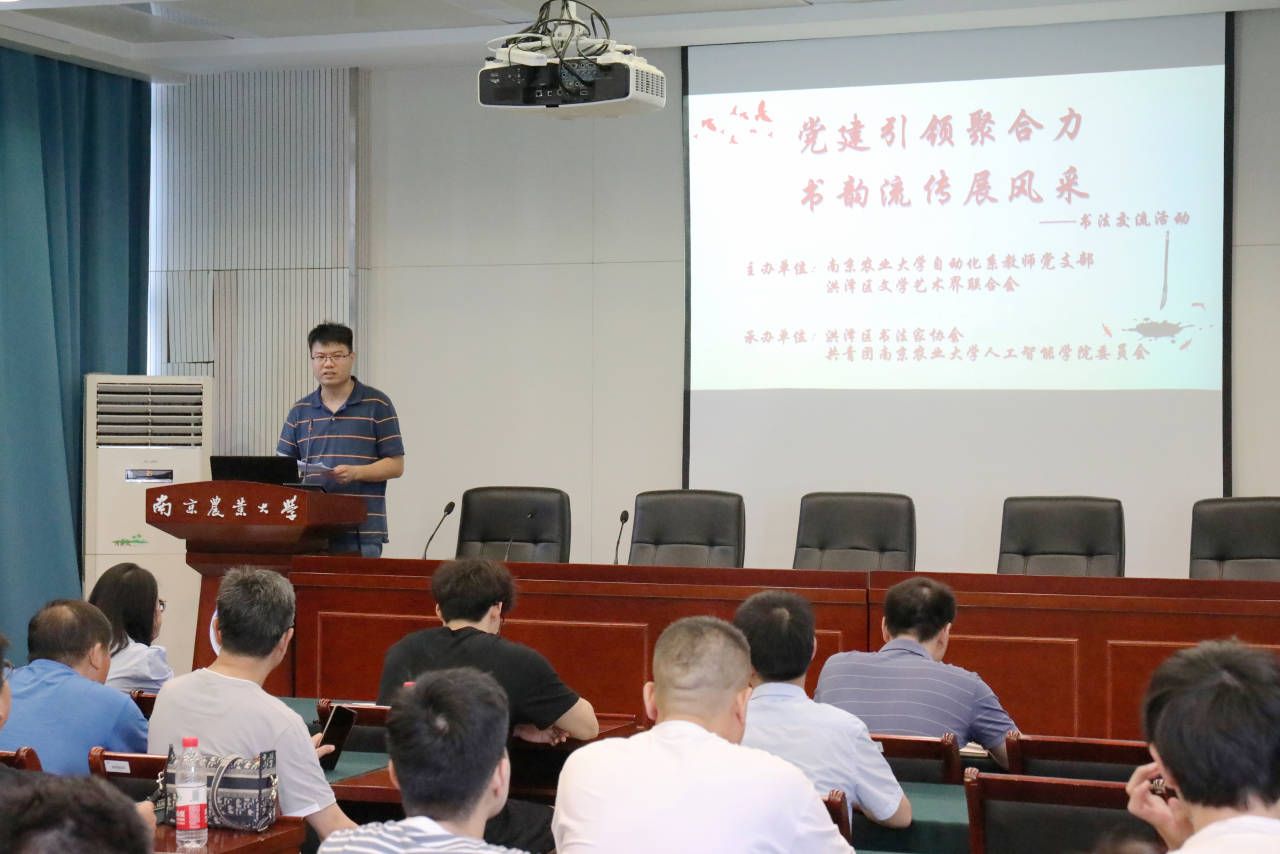 自动化系教师党支部主办。淮安市洪泽区委宣传部原常务副部长、洪泽区人大农经委主任、区书协顾问李大洋,原洪泽区文化局局长、洪泽区人大人代联委主任、区书协副秘书长赵劲松,原区文联主席、区书协顾问胡泽民,书协顾问孙林,中国书法家协会会员、江苏省文联书画研究中心研究员、洪泽区书法家协会主席束其虎,洪泽区书法家协会副主席楚靖、高正梅、徐仕刚以及区书法家协会作者代表出席了此次活动。