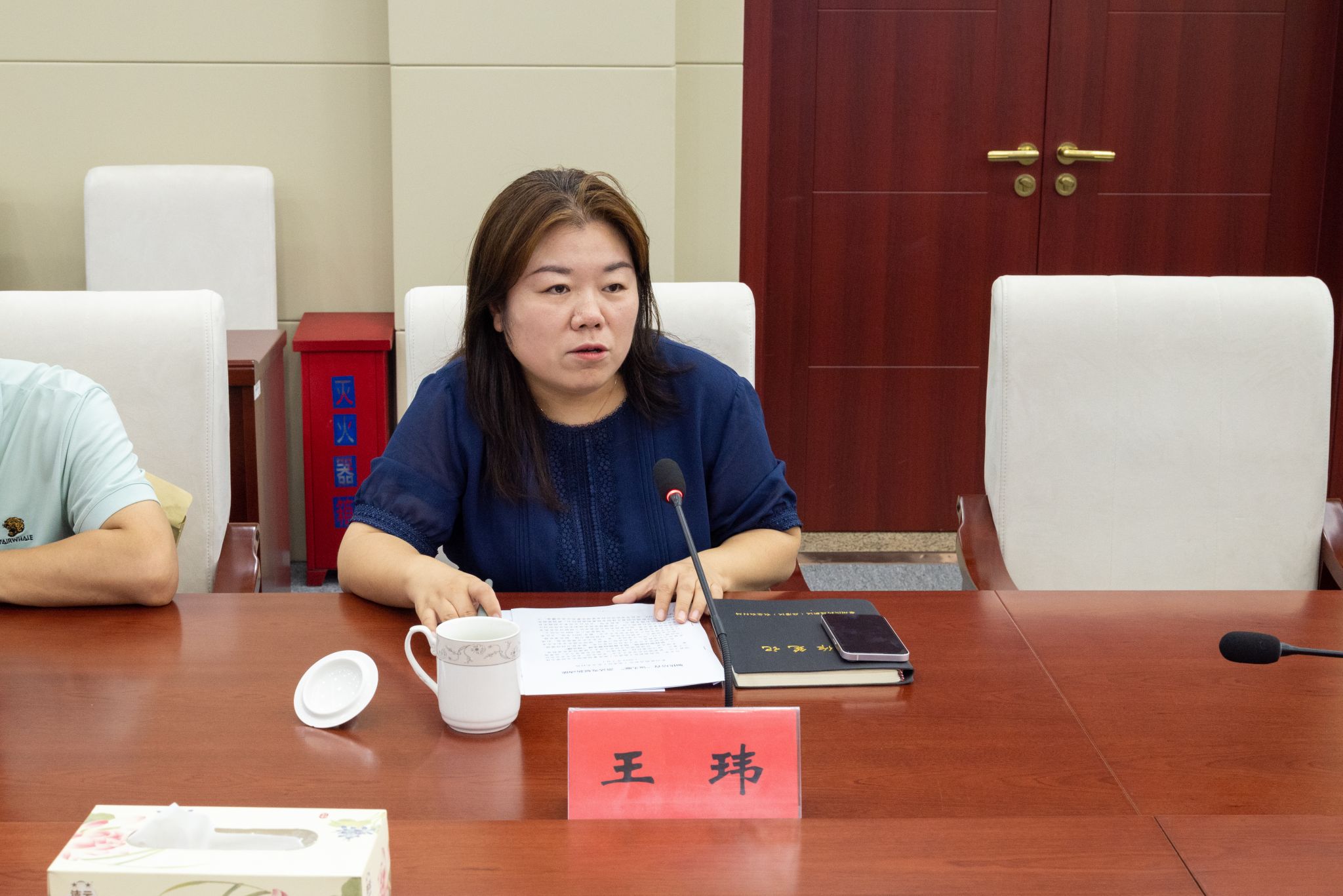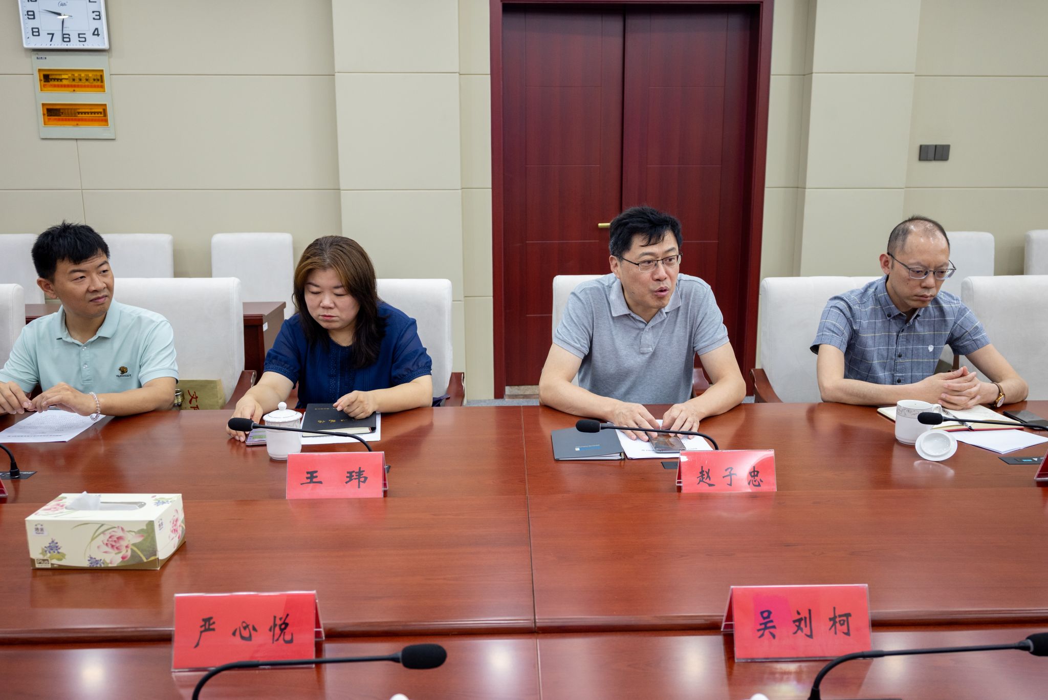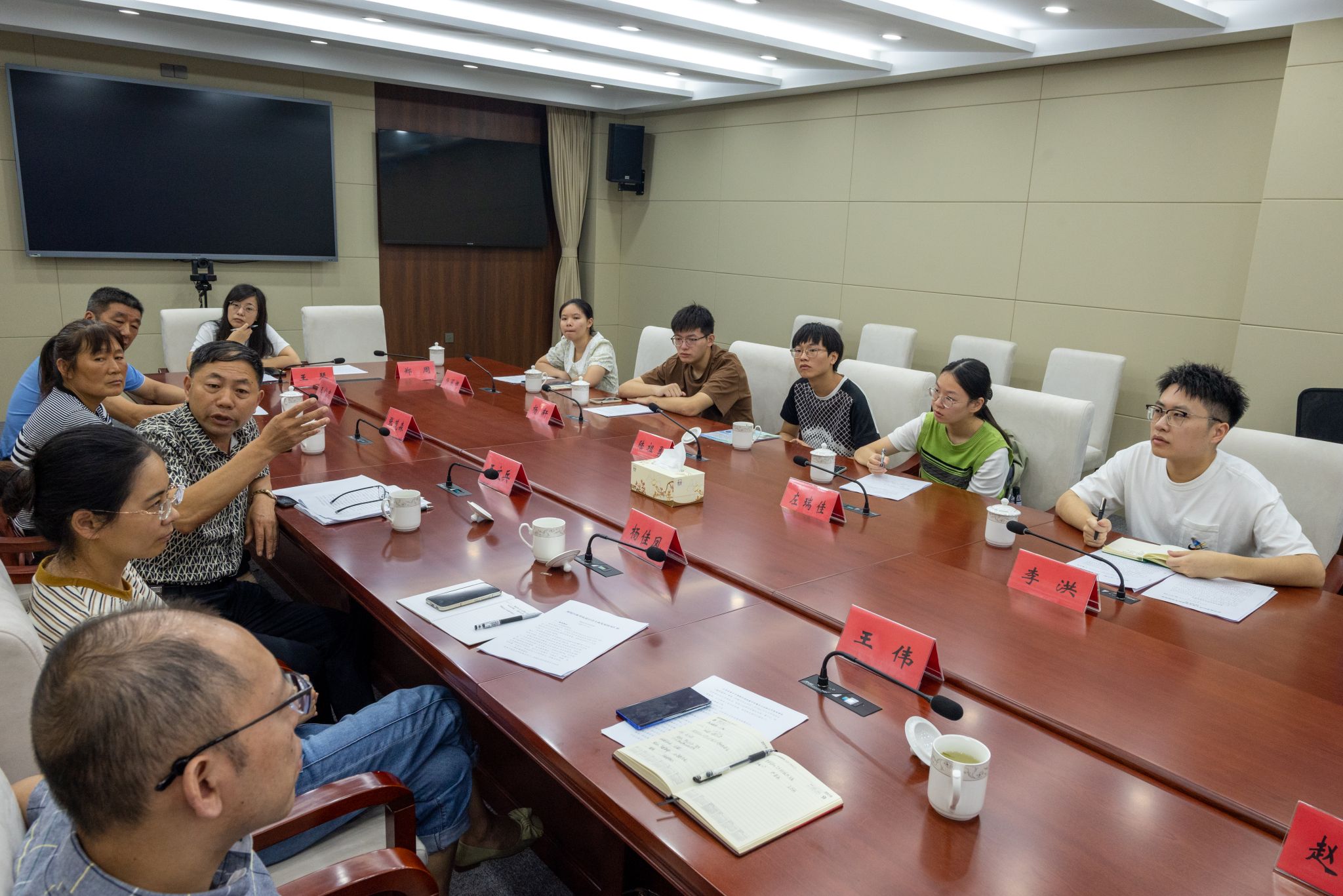 交流中,泰州市农发集团项目经理王伟介绍了集团的智能农业技术采用和研发现状,并对实践团的实地调研活动作出安排,团队在泰州期间还将参观绿色水乡养殖专业合作社、膳泰游家庭农场、杏都葡萄专业合作社,并开展入户调研。