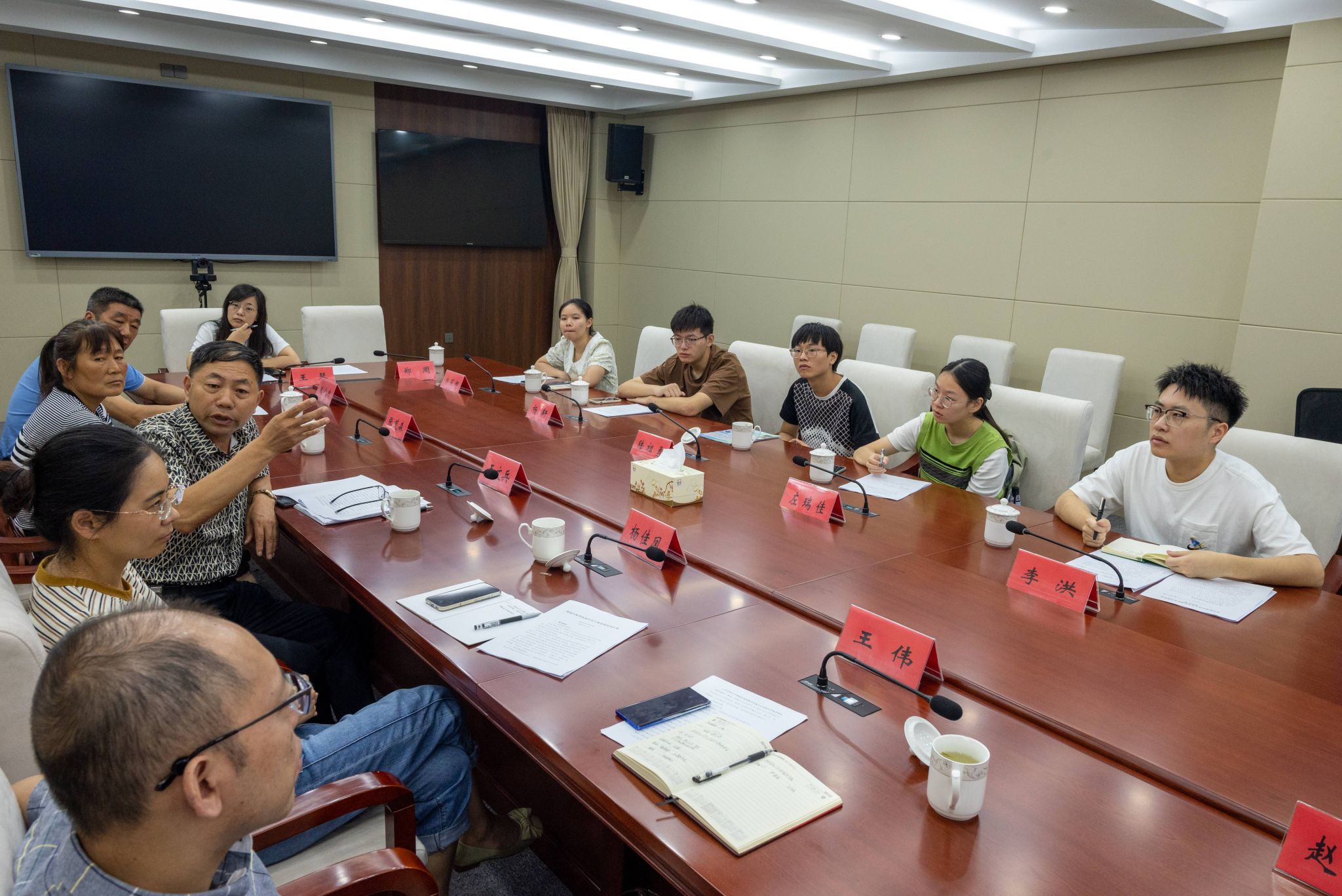 活动伊始,实践团前往泰州市农业农村局开展科技助农工作调研,与泰州市乡村振兴局、各区县农业农村局、农业企业及家庭农场负责人代表,重点围绕经营主体的智慧种养技术瓶颈、技术迭代升级等问题开展交流,并对后续的实地调研活动作出安排。泰州市乡村振兴局副局长赵子忠主持座谈会议,并介绍泰州市在水稻绿色高质高效创建、国家粮食产业园智慧农场、畜禽粪污资源化利用、农产品质量安全监测体系建设等方面形成的科技助农成果。