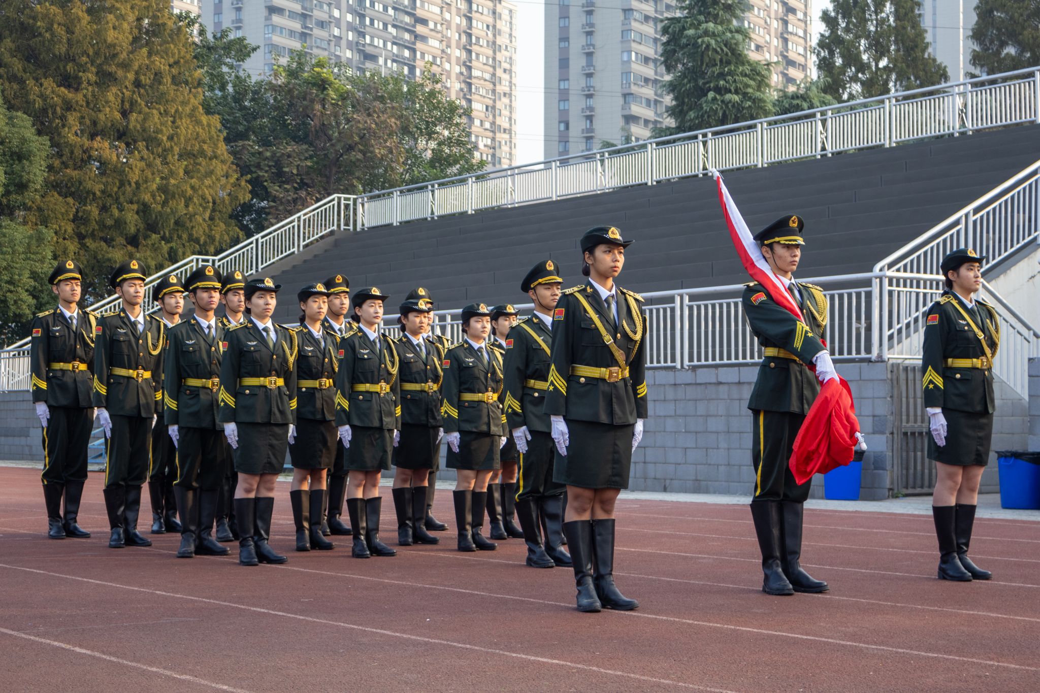 上午8时,全体运动员就位后,升旗仪式正式开始。仪仗队步伐整齐,阔步迈进,在嘹亮的国歌声中将五星红旗升起。