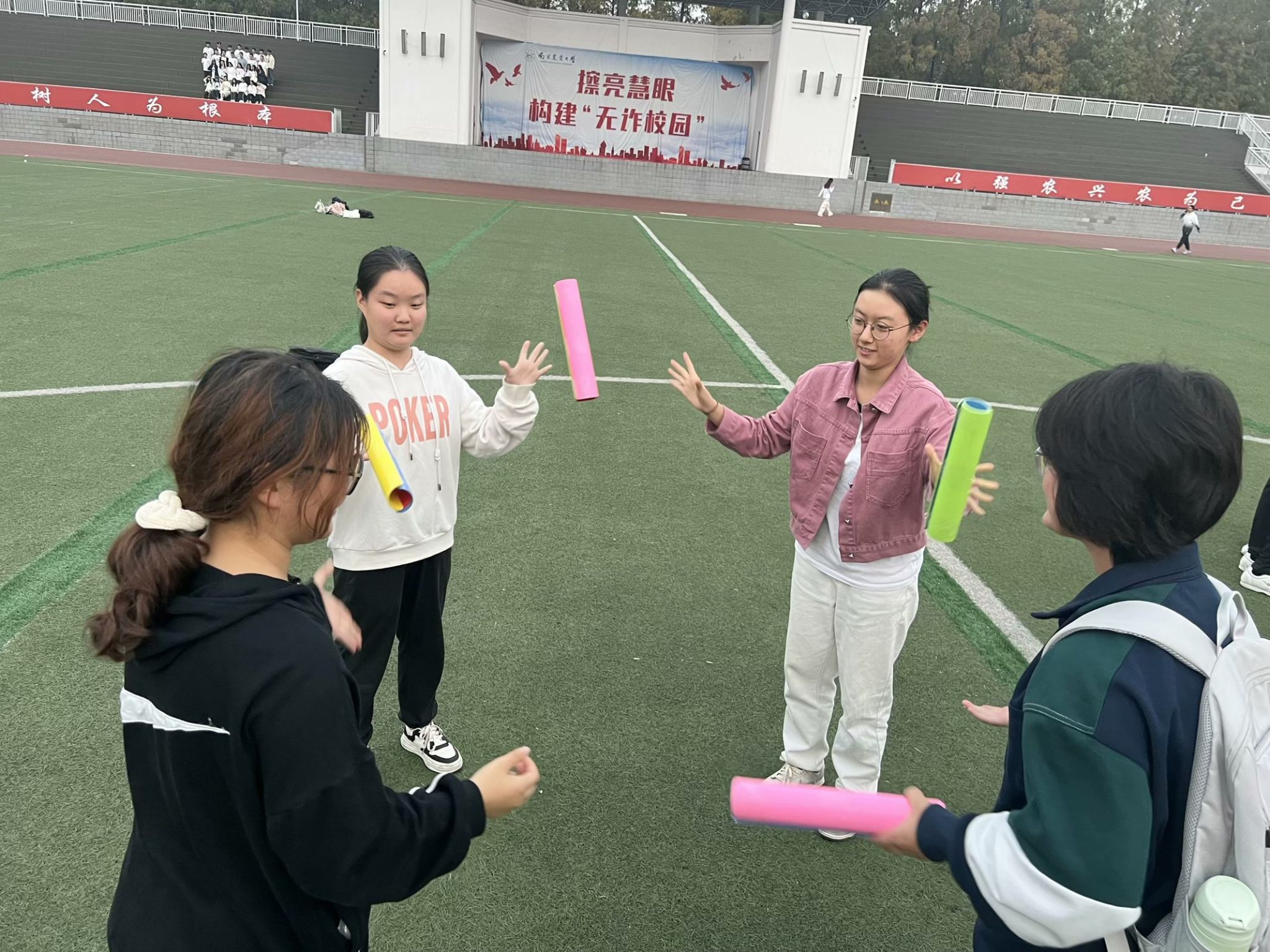 最后进行的是活动三——“欢送旧秋,喜迎新冬”户外活动,参与者需要以小组为单位完成“群龙戏珠”、“口是心非”、“力量传递”三个趣味游戏。妙趣横生的精彩小游戏不仅能够提高宿舍默契度,增进宿舍感情,更能够增强宿舍整体的凝聚力,在活动中取得优异成绩的小组还有机会获得活动精美礼品。