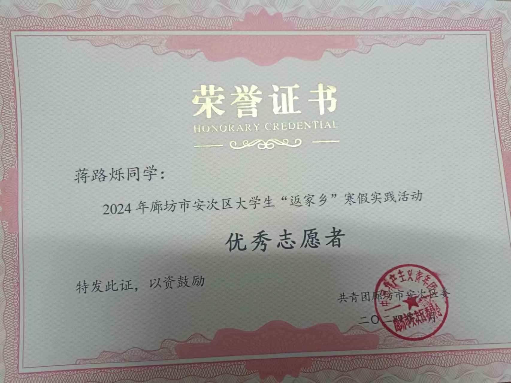 实践中,还涌现了一批优秀的学子。其中,蒋路烁同学受到共青团廊坊市安次区委表彰,获评“优秀志愿者”荣誉。
