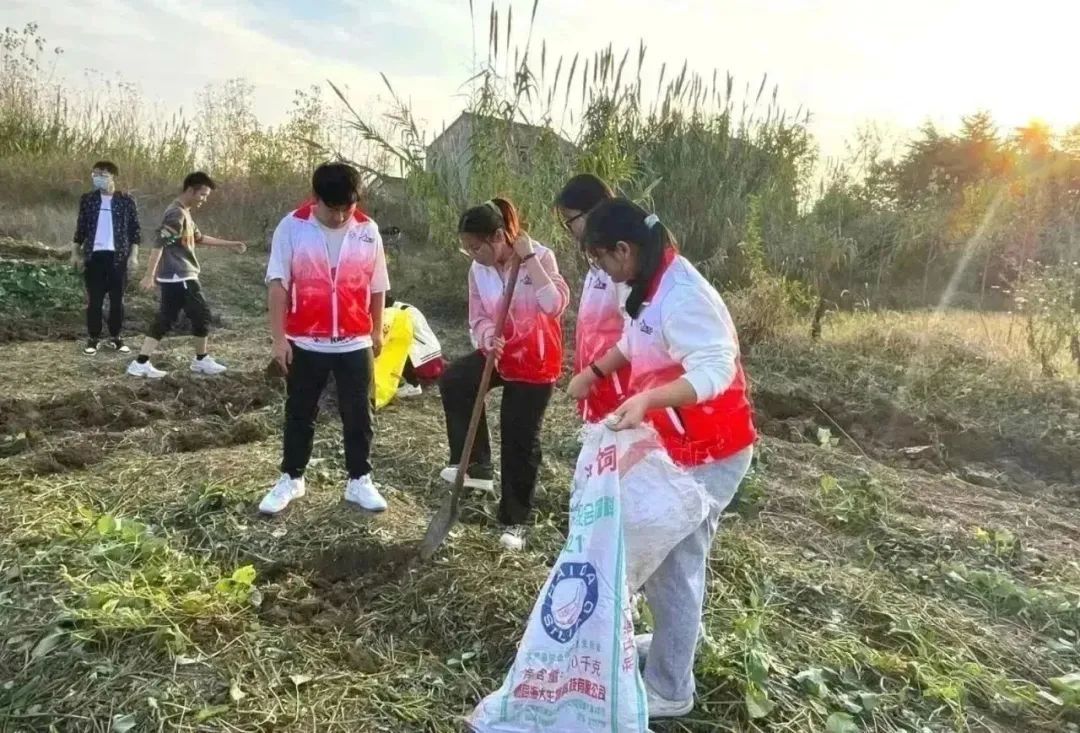 在程桥街道长青社区于营组,同学们穿上红马甲,走进田间地头开展一场“非你莫‘薯’”助农志愿活动,在红薯地进行采摘、分拣、装袋,帮助农户解决红薯丰收季的燃眉之急。
