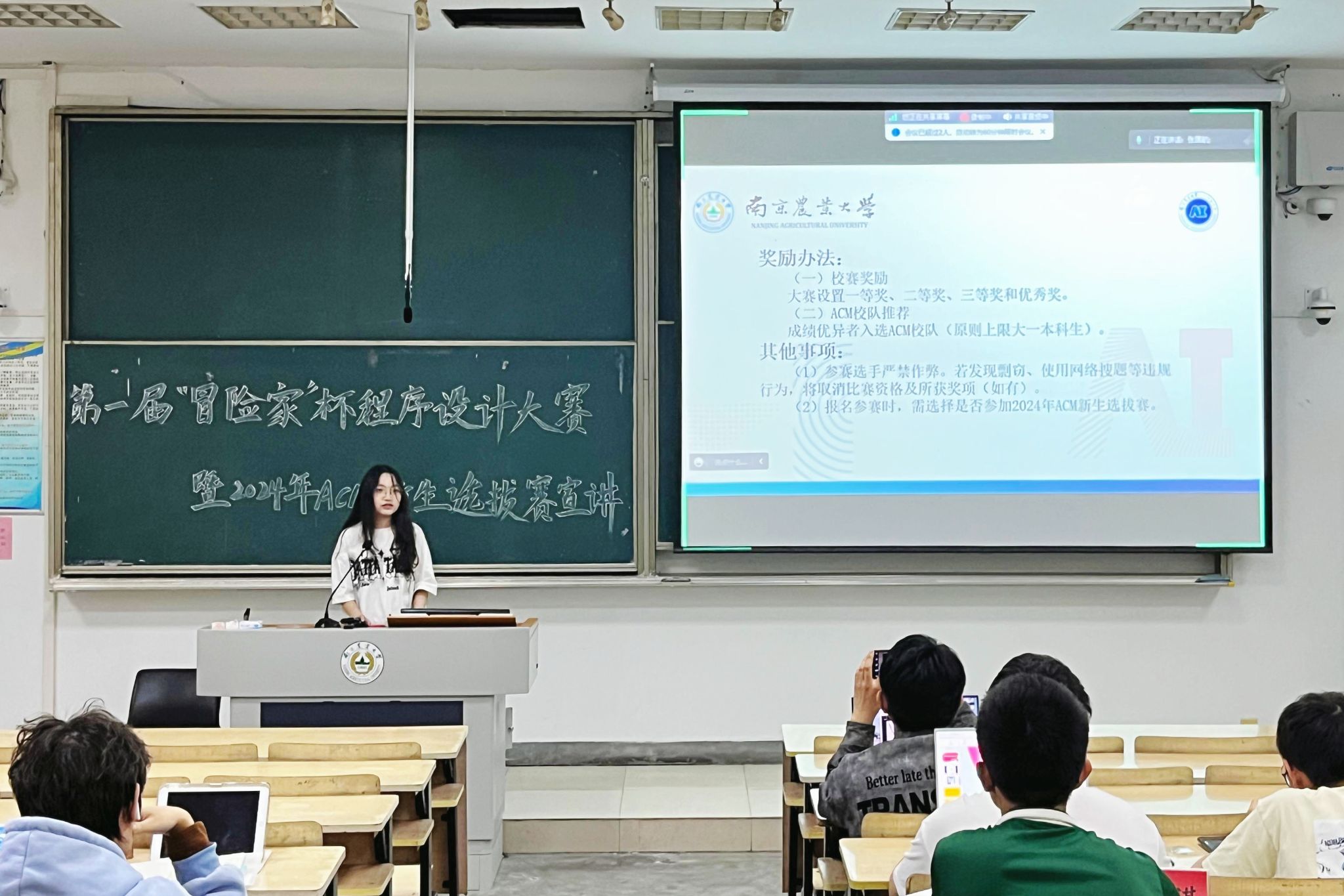 4月27日,大赛宣讲会在浦口校区汇贤楼C102举行,由组委会对本次大赛的参赛形式、竞赛内容、奖励办法、竞赛安排等进行说明,并邀请ACM校队成员介绍本次校队选拔的有关要求。