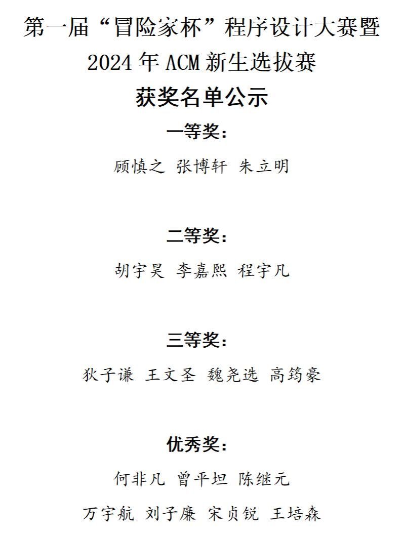 本次程序设计大赛的成功举办,为参赛者提供了一个展示才华的平台,也为ACM校队注入了新的活力,为同学们参加专业竞赛打下坚实的基础。