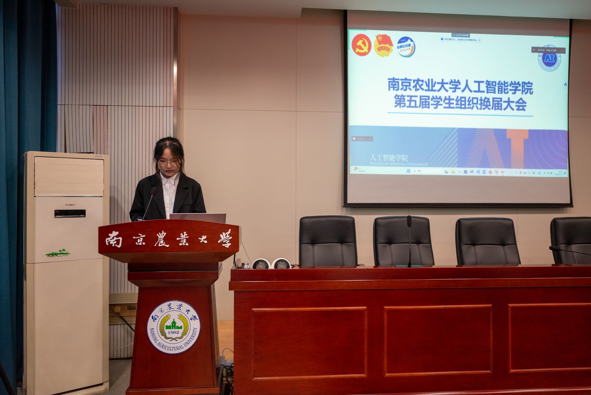 会议伊始,全体起立,奏唱国歌,在庄严的国歌声中,换届大会正式开始。院分党校秘书长沈豪杰、学生团委常委苏玥名、全媒体中心责任编辑卿舒婷、AI工坊主席李文分别做本学年工作总结汇报,同学们认真听取、审议上一届学生组织工作报告。