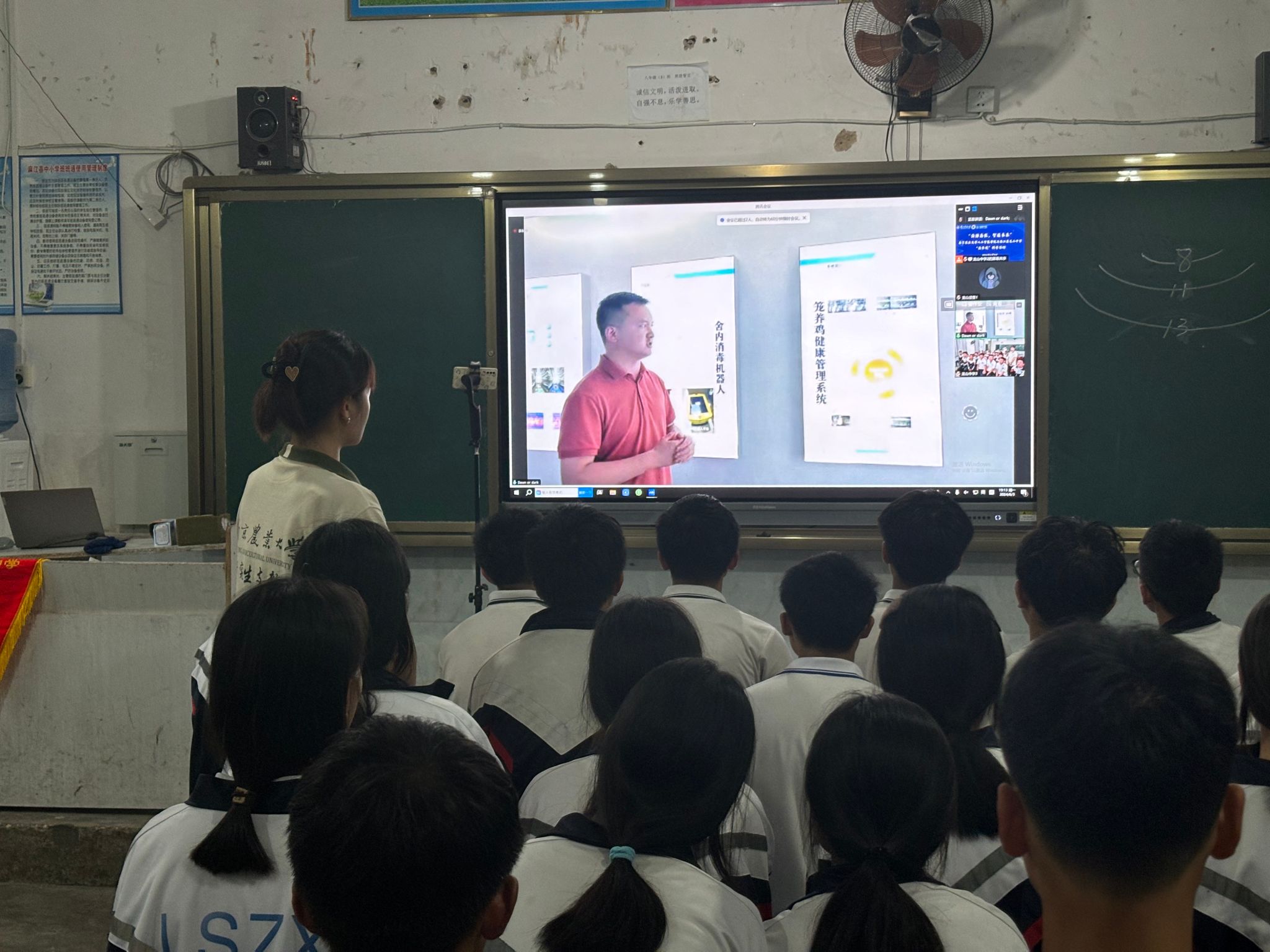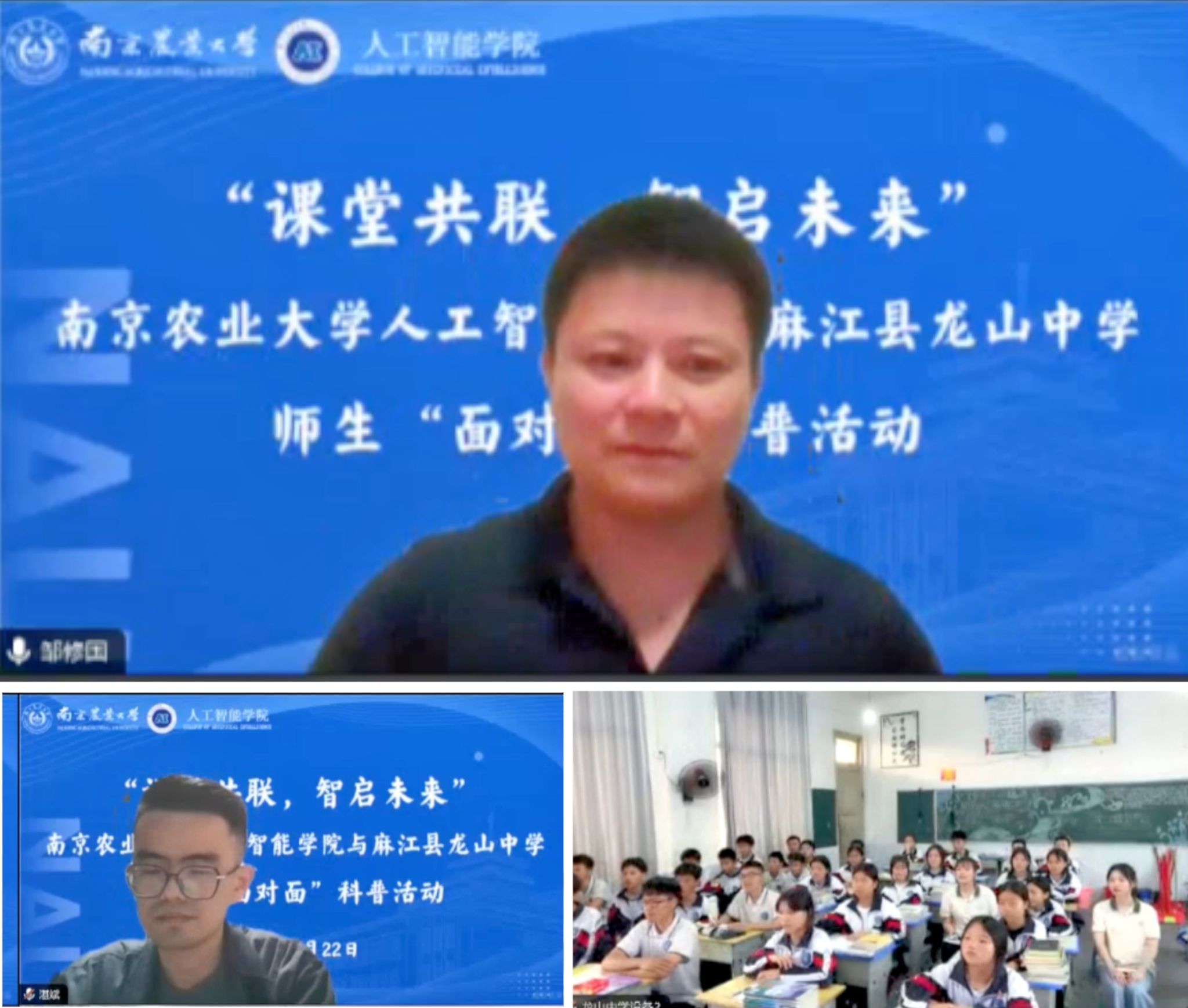 邹老师选取实验室内“规模化养鸡场巡检消杀机器人”“奶牛场巡检机器人”“蓝莓采摘机器人”等科研成果,结合初中生特点,深入浅出地介绍了各类农业机器人的设计初衷及实际效能。此次讲授有效激发了龙山中学学生的兴趣,远程互动氛围热烈,同学们纷纷提出问题,邹老师耐心作了详细解答。