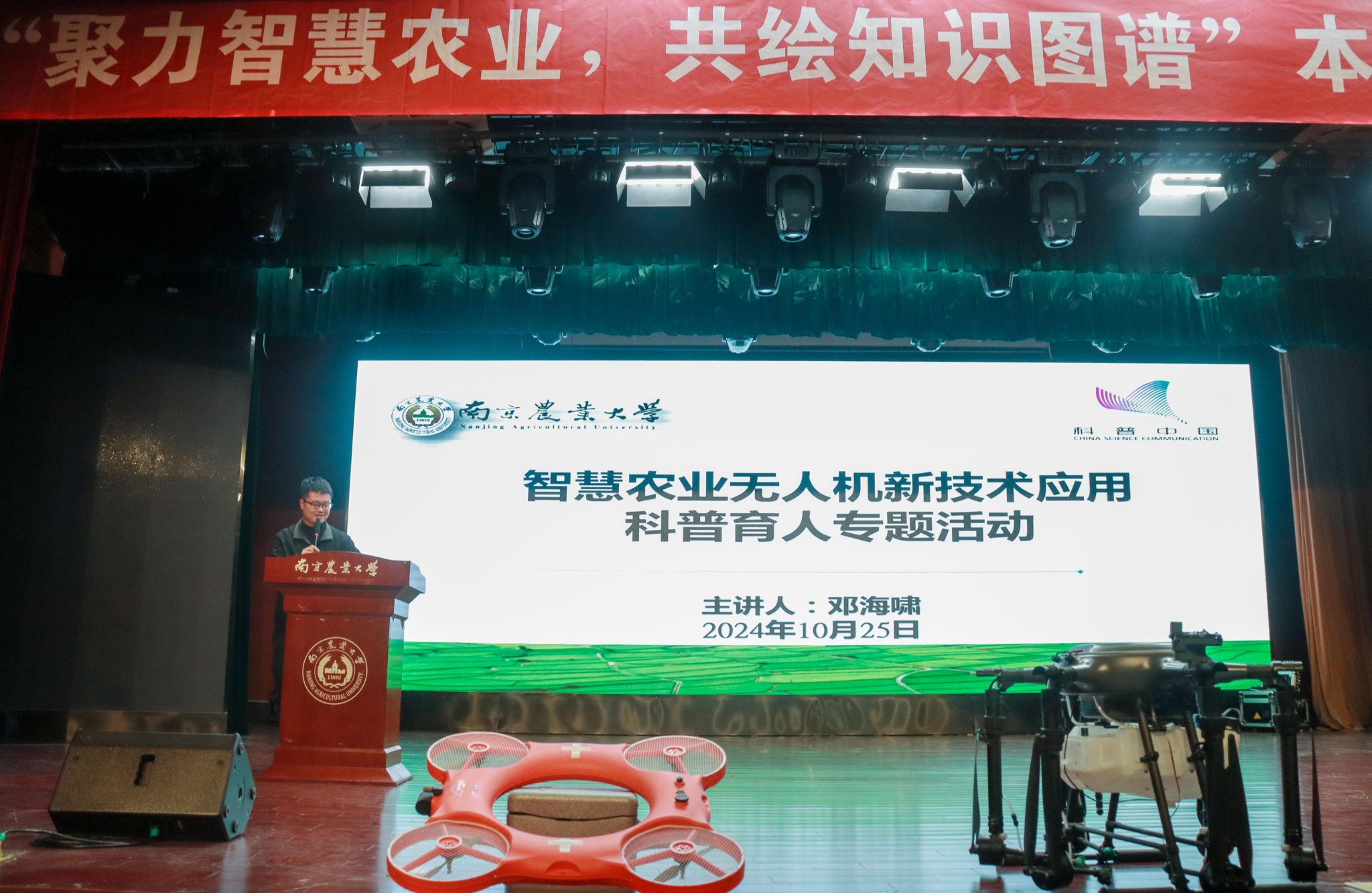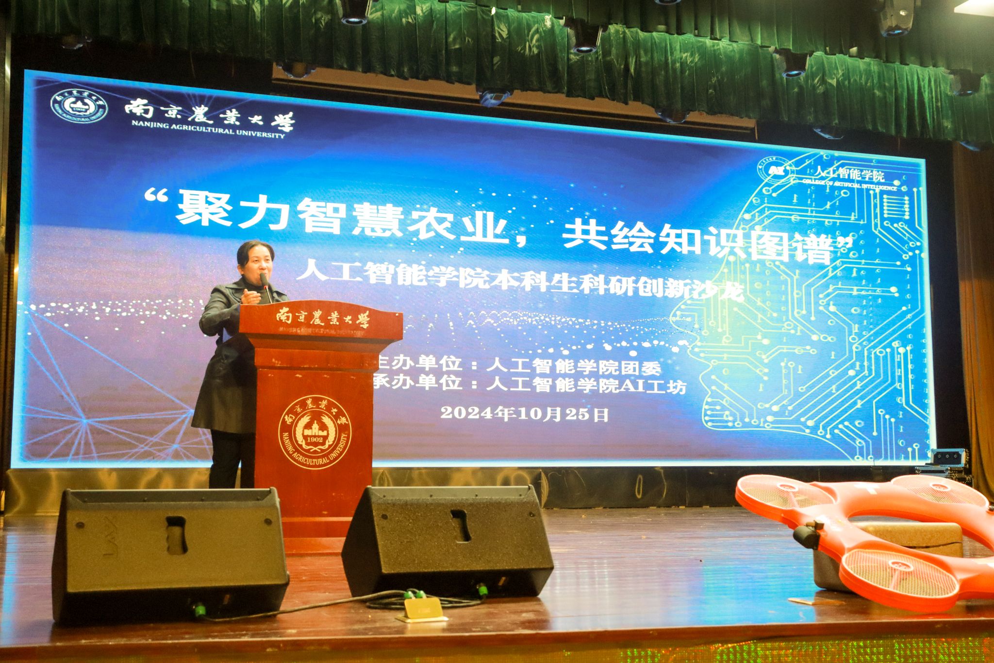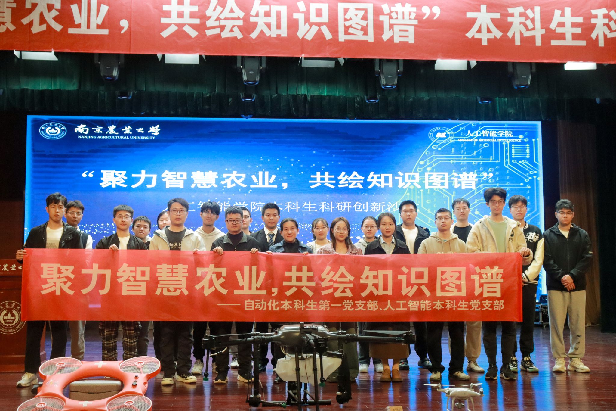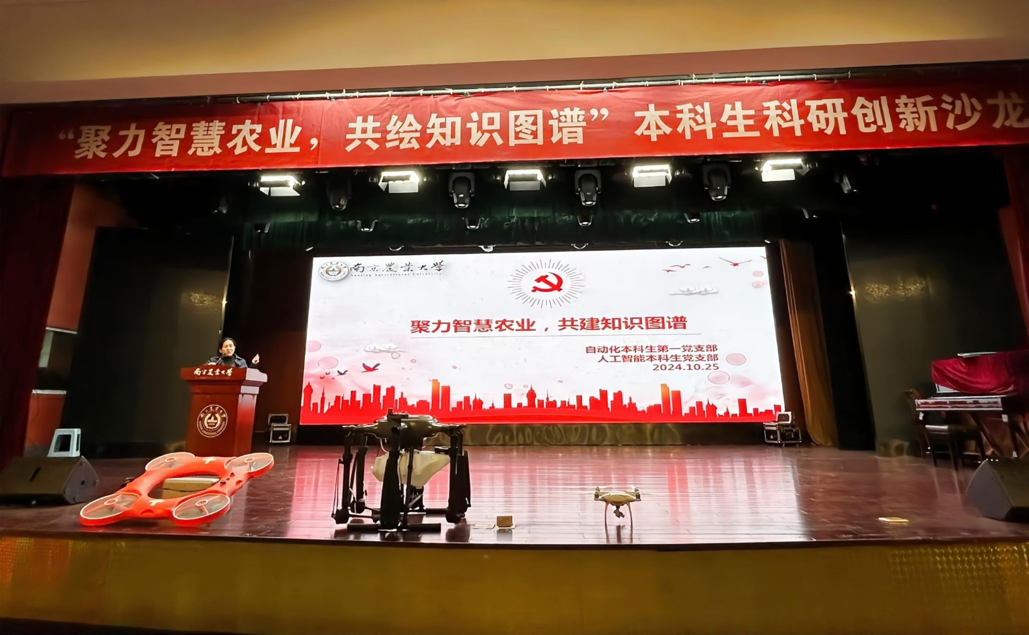 在浦口校区大学生活动中心举办“聚力智慧农业,共建知识图谱”本科生科研创新沙龙。学院2016届校友、南京诚朴无人机有限公司创始人邓海啸,计算机系副系主任、自动化本科生第一党支部书记钱燕副教授,负责本科生科创工作的辅导员、人工智能本科生党支部书记李洪,本科生辅导员杨荣出席活动,钱燕团队研究生、活动主办支部党员及全体大一新生参与活动。