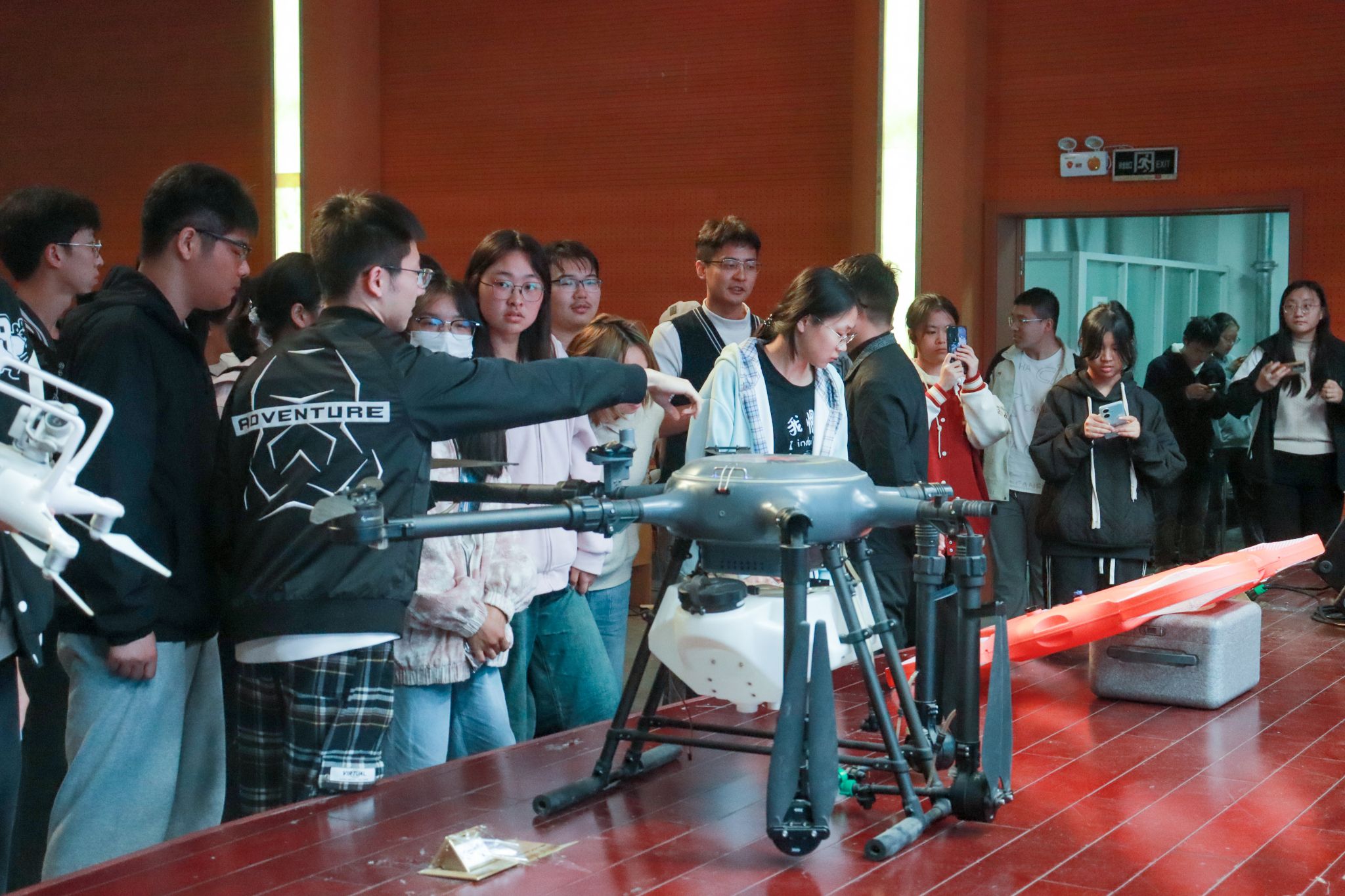 讲座结束后,同学们纷纷走向现场设置的实物展示区。邓海啸、钱燕团队研究生为同学们现场演示农用无人机的操作,分别就实验室选择、课业与科研的平衡及科研能力提升等问题与现场同学们进行互动交流,鼓励大家了解科研、投身科研,找到适合自己的科研之路。