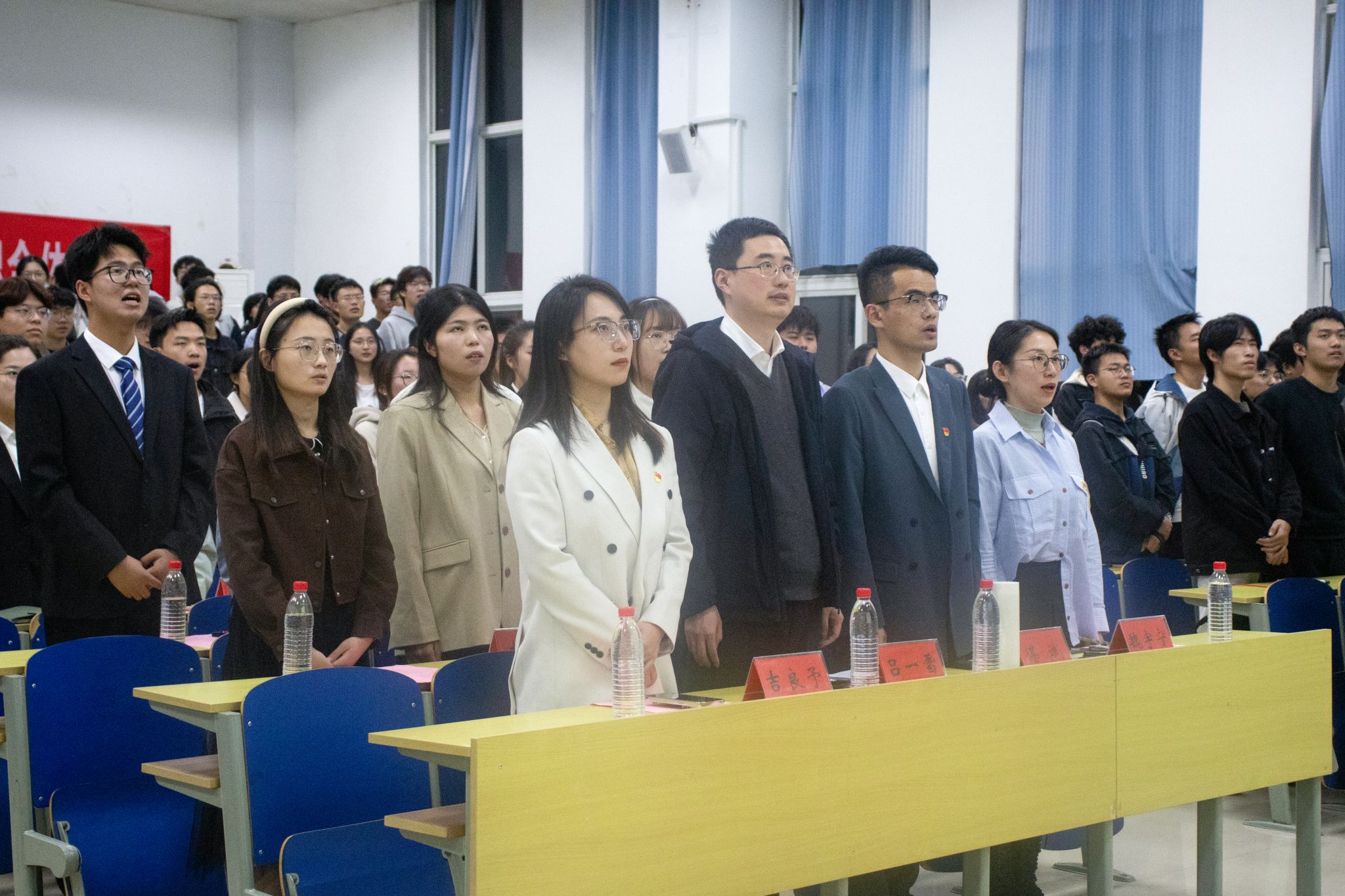 大会伊始,全体师生起立奏唱国歌。