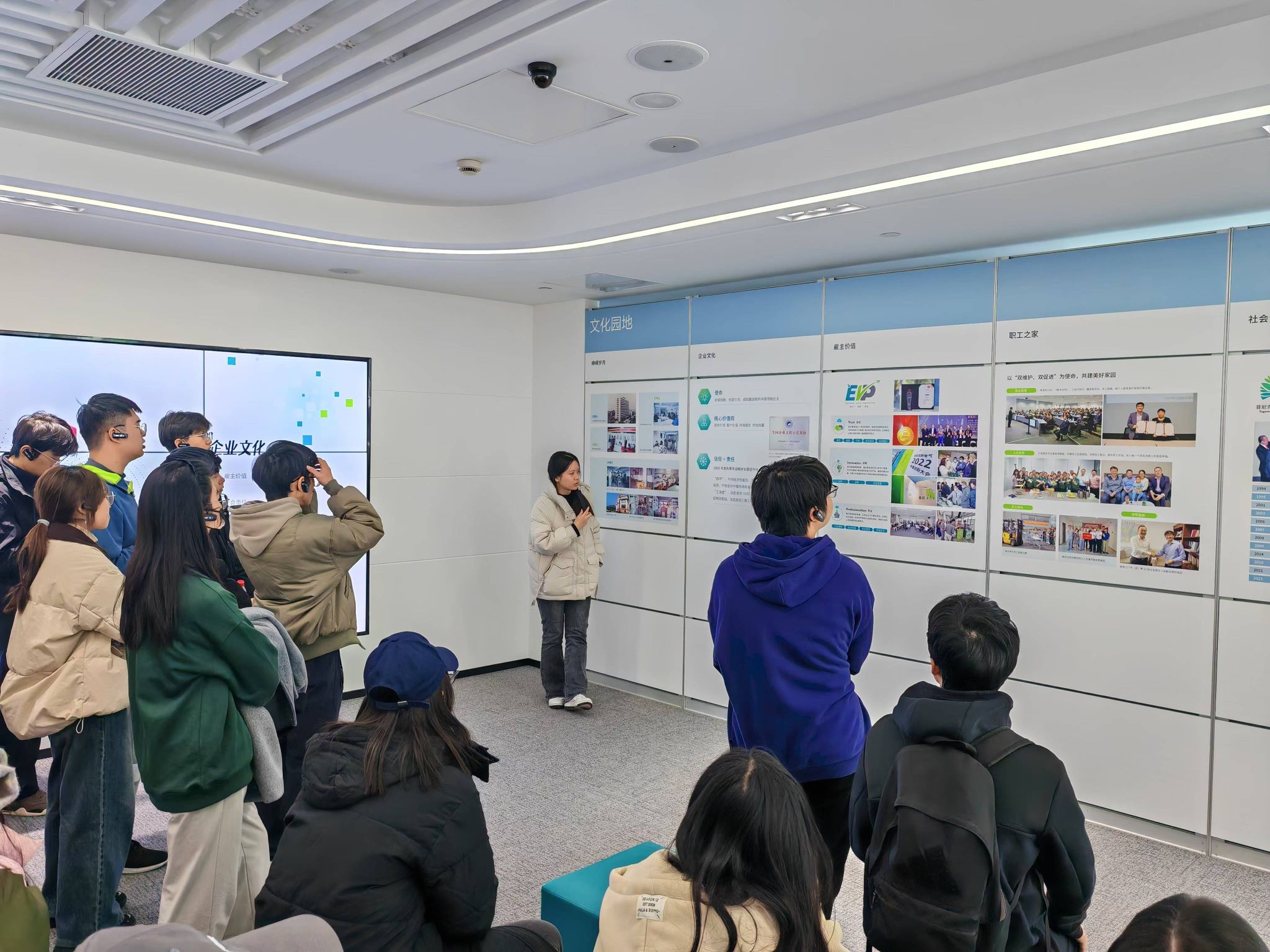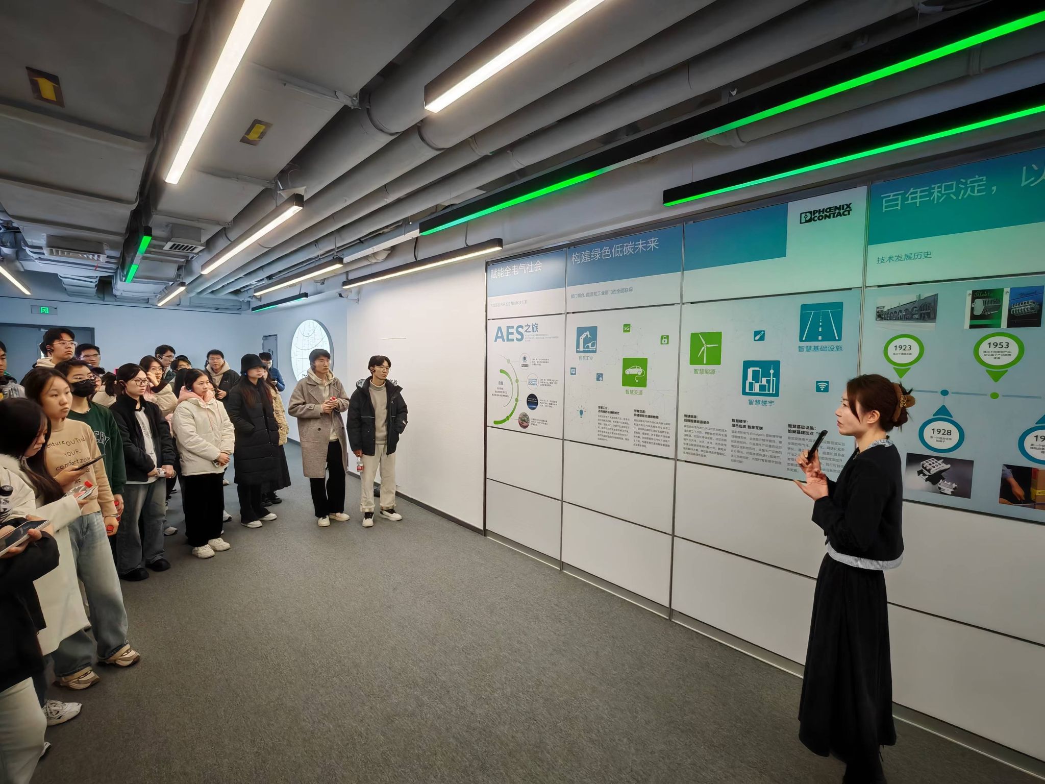 解说员于智能绿色精益工厂的廊桥中向学生介绍了菲尼克斯于电气连接、电子接口和工业自动化领域的技术成就,通过实地参观智能工厂注塑车间高度自动化的生产流程,向学生展现了全国首家智能物流系统的高效运转。随后,师生移步总部基地展厅,近距离观察到了非标注塑件的生产过程,于电机嗡鸣中感受电气化对生产效率的提升。