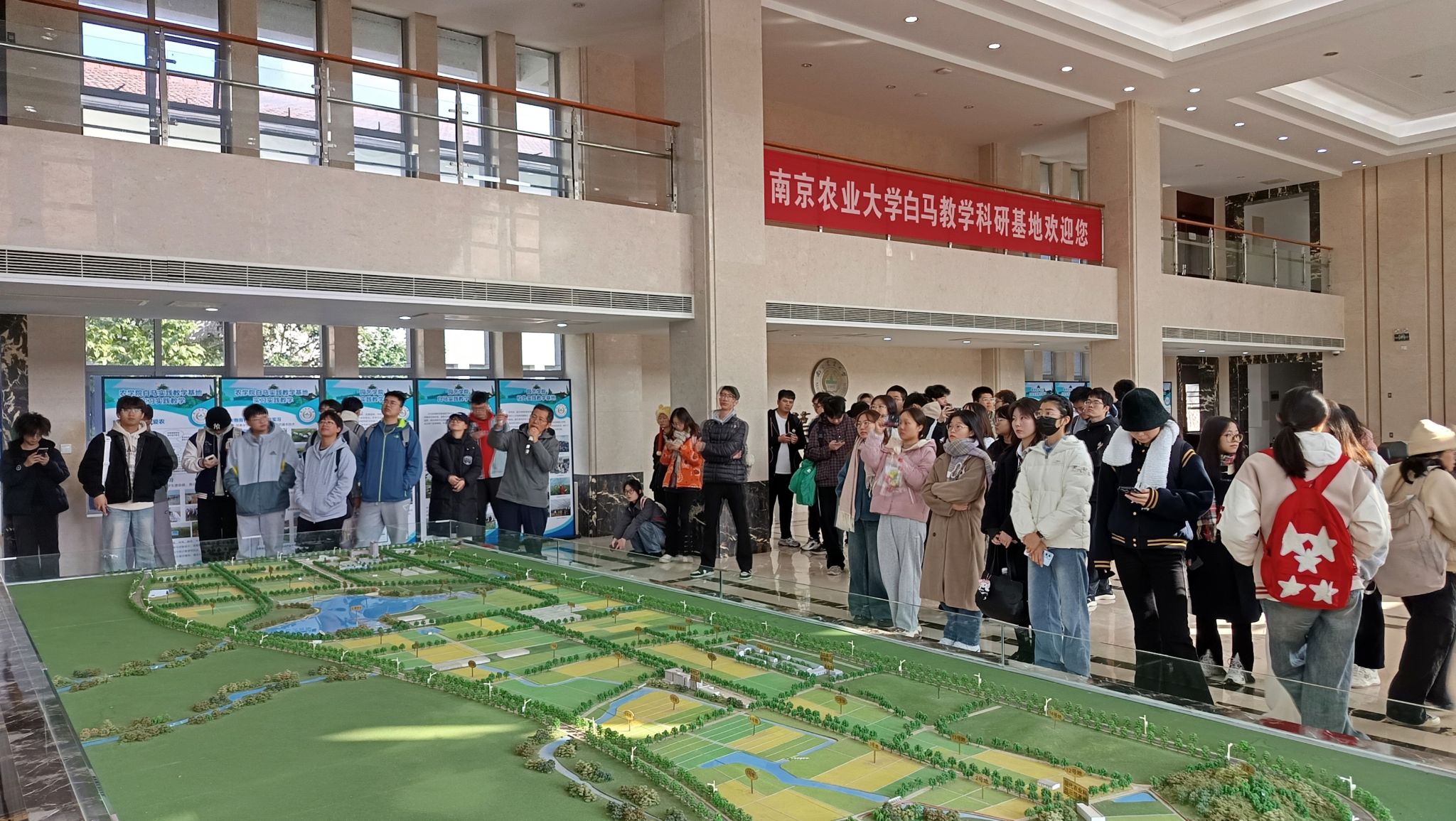 指导老师于沙盘前讲解白马教学科研基地的建设发展历程与相关科研平台,并深入浅出地带领学生了解白马基地的科研成果,提高学生对农业前沿领域的认知水平。随后学生在老师的带领下参观了位于白马基地的智能温室,以展现自动化专业知识于农业领域的前沿应用,激发学生们的学习热情。最后全体学生于白马基地大门处合影留念,结束了当日参观。