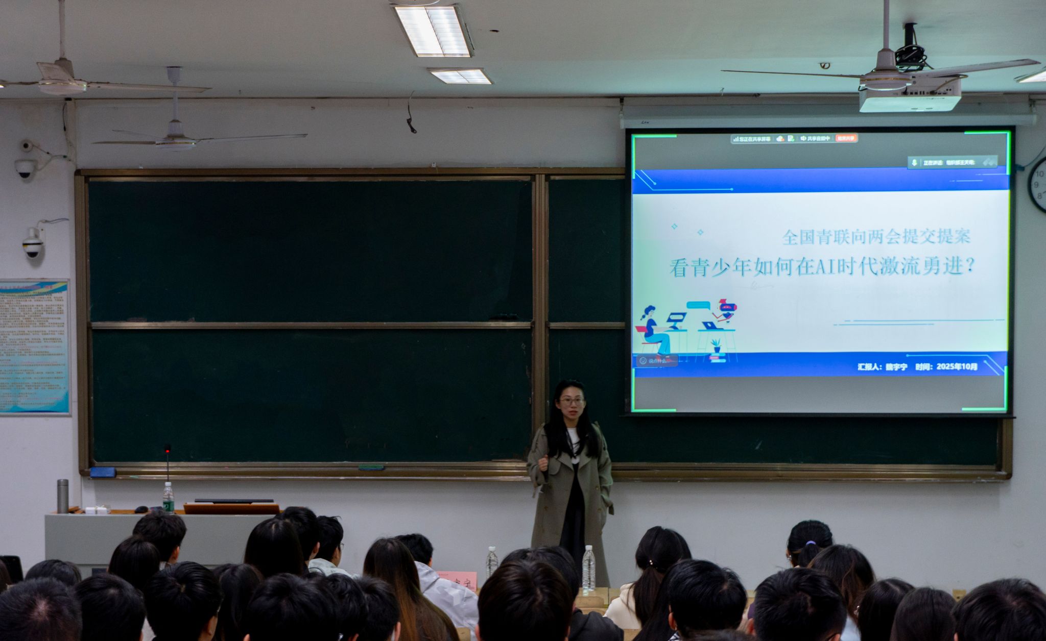 团委副书记魏宇宁作为主讲人,围绕全国青联两会提案《积极适应新一轮科技革命和产业变革正确运用人工智能赋能青少年发展》,以青年视角解读AI与成长的关联,引导学子争做智能时代“驾驭者”。