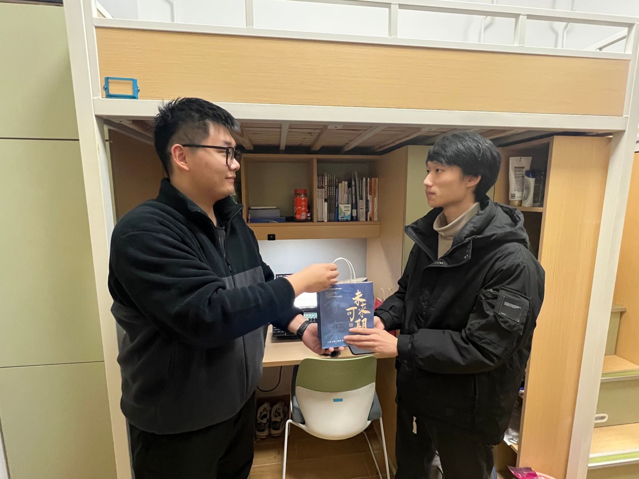 党委副书记吕一雷,副院长陆明洲,学生工作办公室副主任魏宇宁,辅导员封筱等老师们与志愿者们一同,为前来领取礼品的考研学子们送上亲切的问候与暖心的物资。与此同时,党员代表们也深入学生宿舍,亲手将这份温暖与关怀传递到每一位考研学子手中。这份冬日里的关怀,让独自奋战的研途不再孤单,生动诠释了学院师生之间、高低年级同学之间的深厚情谊与团结互助的精神。活动尾声,志愿者们认真整理场地,并合影留念,定格下这个充满友爱与温情的瞬间。
