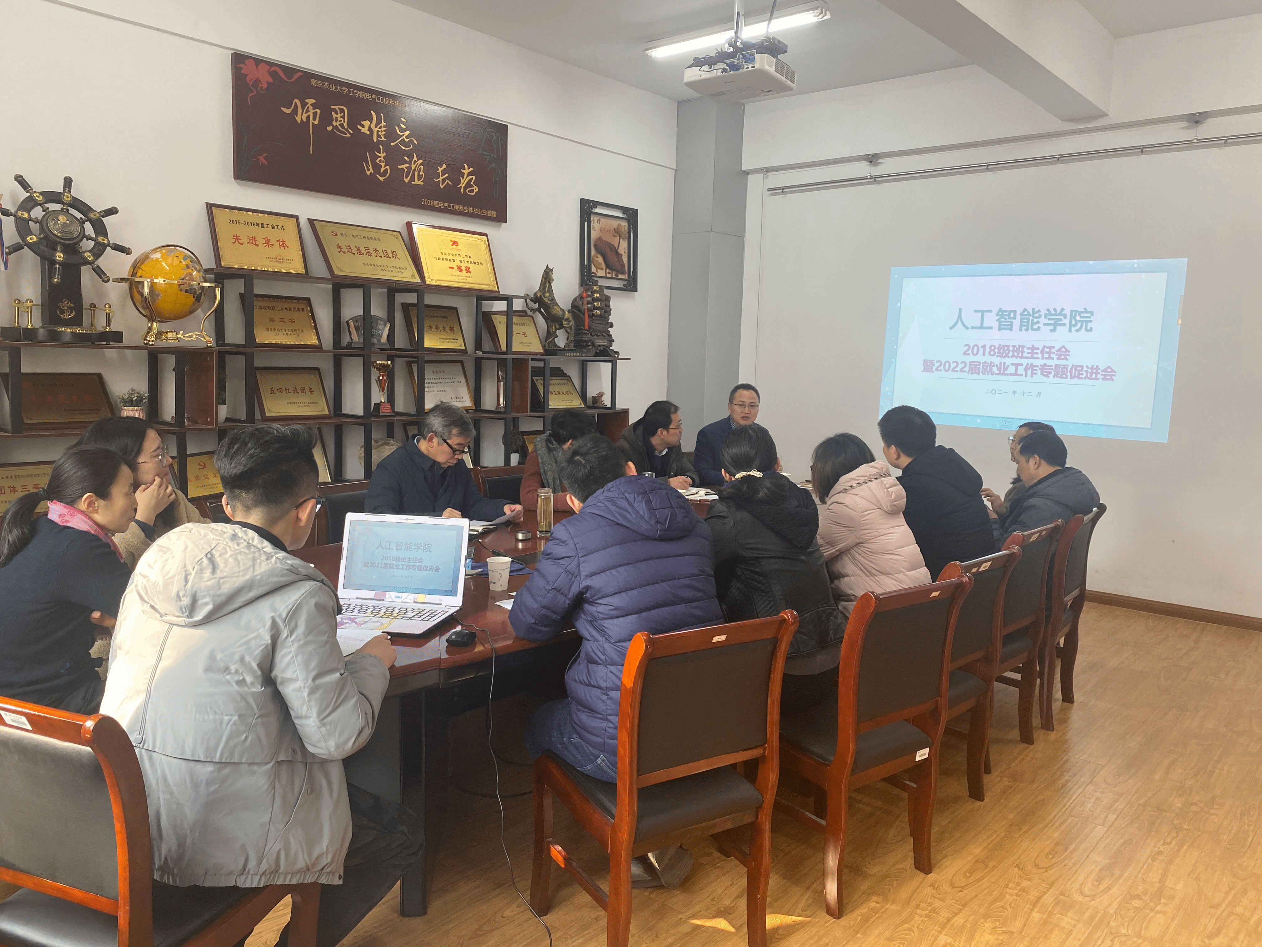 在浦口校区育贤楼B311召开2018级班主任会暨2022届毕业生就业工作专题促进会,卫岗校区同步线上直播。院长徐焕良、党委副书记(主持工作)沈明霞、党委副书记卢伟、副院长刘杨、各系主任、全体2018级班主任老师及全体辅导员参与此次会议,会议由卢伟主持。