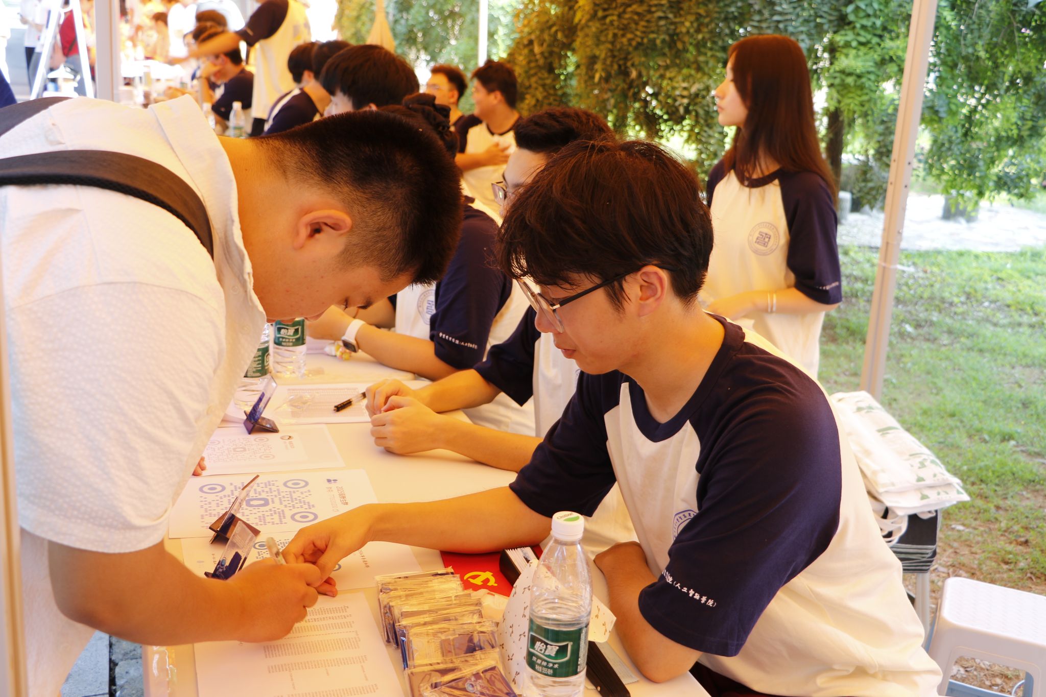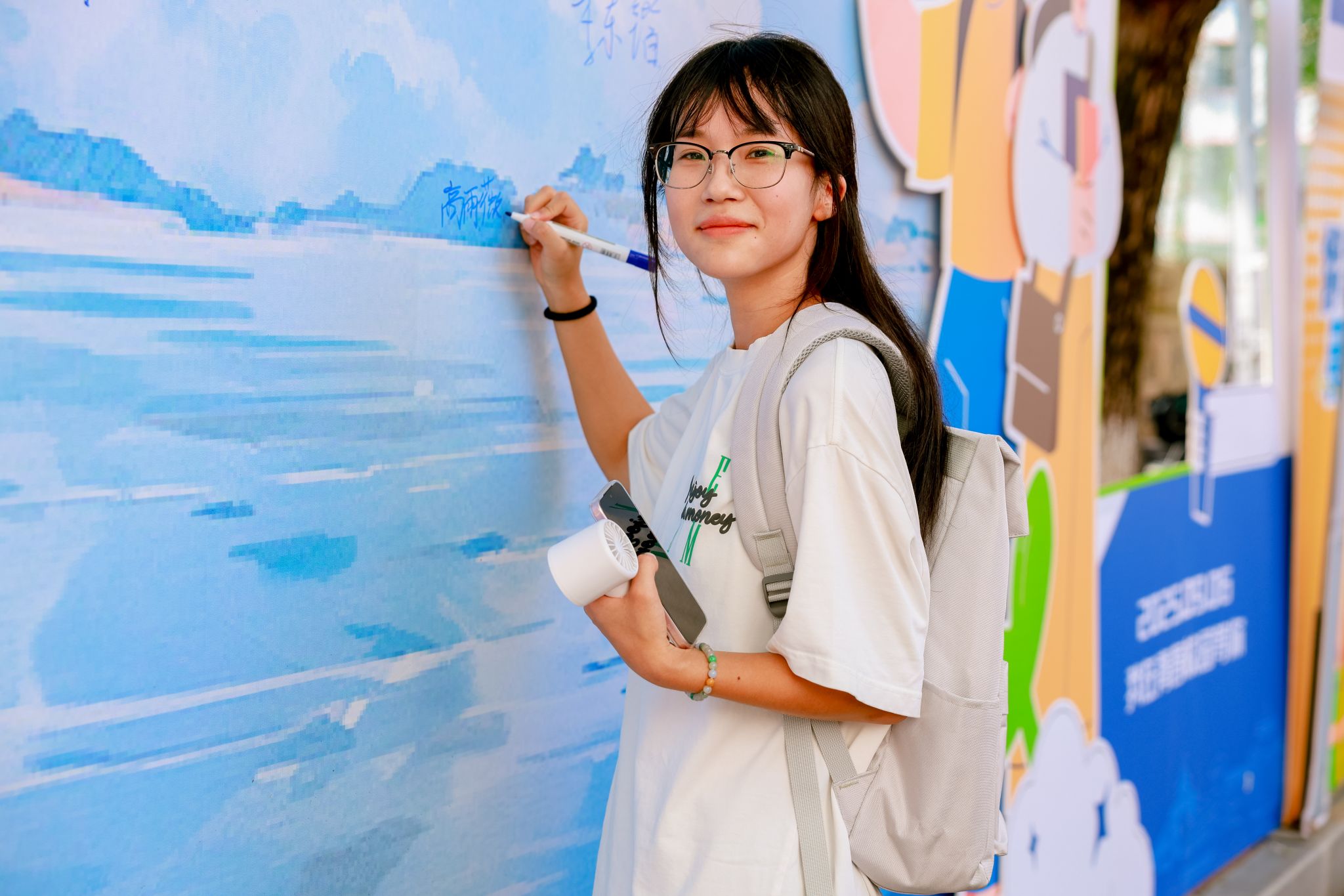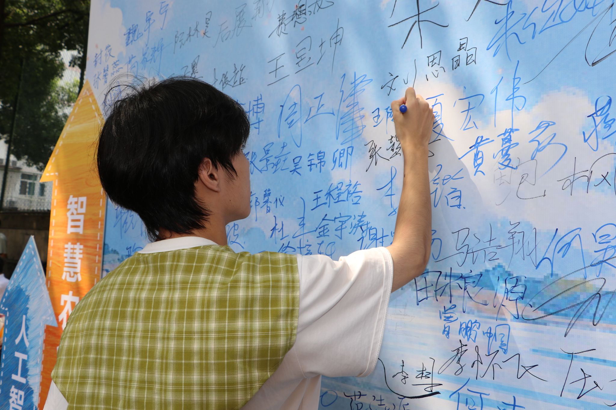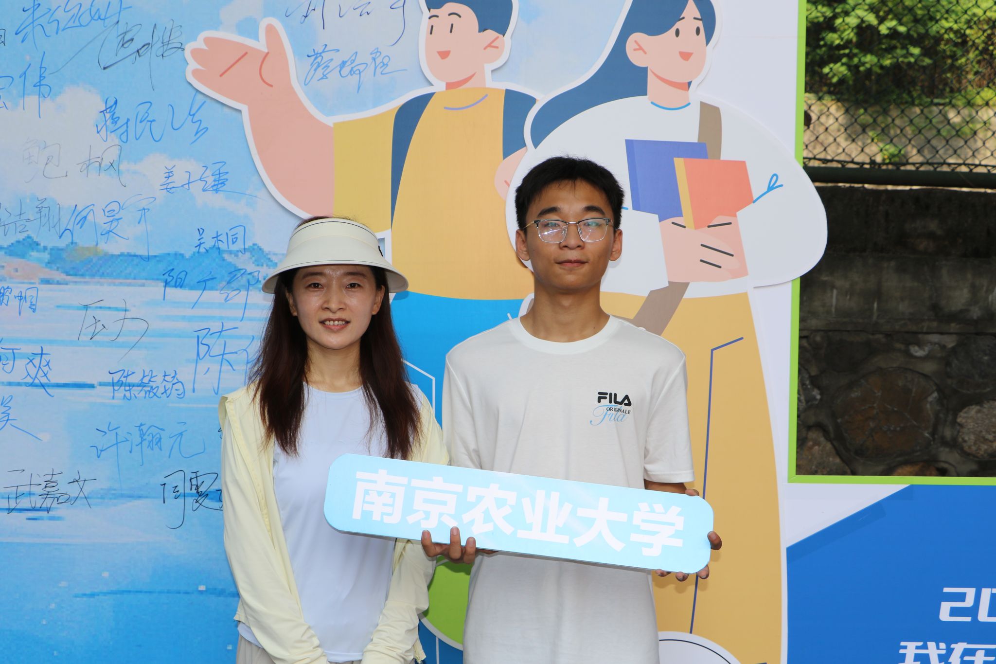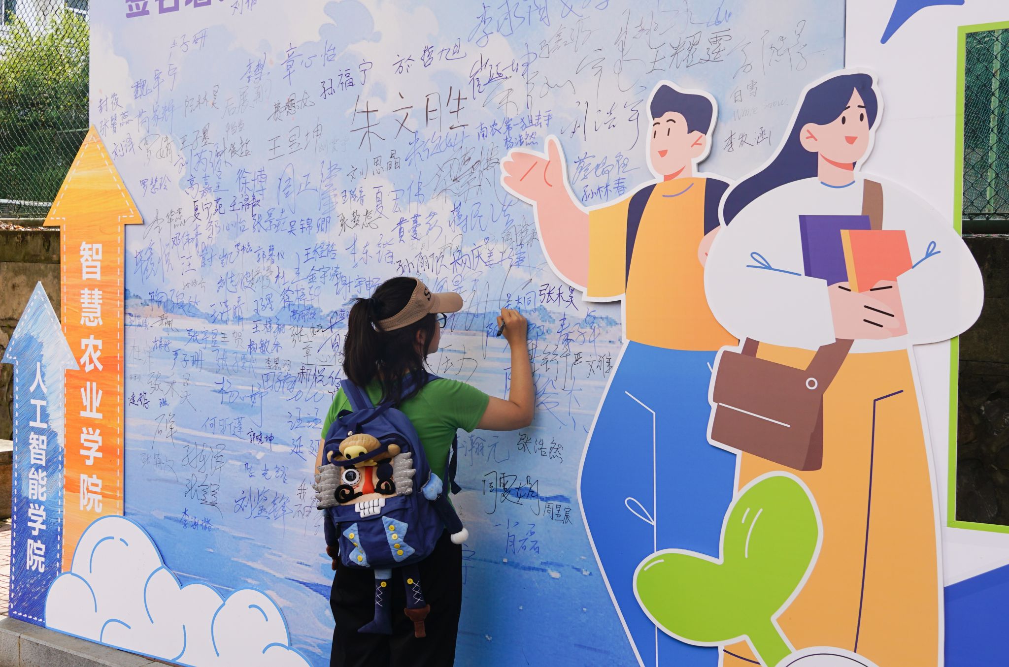 学院特别打造的主题签名墙成为迎新现场的视觉焦点——以蓝色为主色调的背景板上,“萝莉岛
