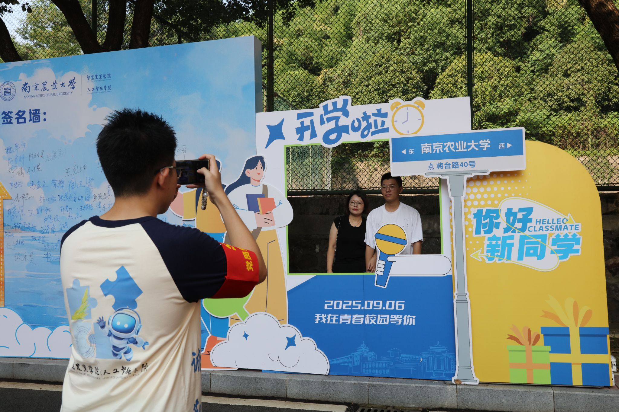 开学啦”立体字样熠熠生辉,“你好,新同学”的暖心标语与新生们的签名交相辉映,定格下他们与学院的初见之喜。我们相信,与学院的第一次相遇值得被郑重收藏:今天为你定格的初见瞬间,将由学院悉心留存四年。待毕业季来临,学院将在滨江校区为你复刻此刻的光影,用两张跨越时光的照片,串联起从青涩入学到从容毕业的成长轨迹。