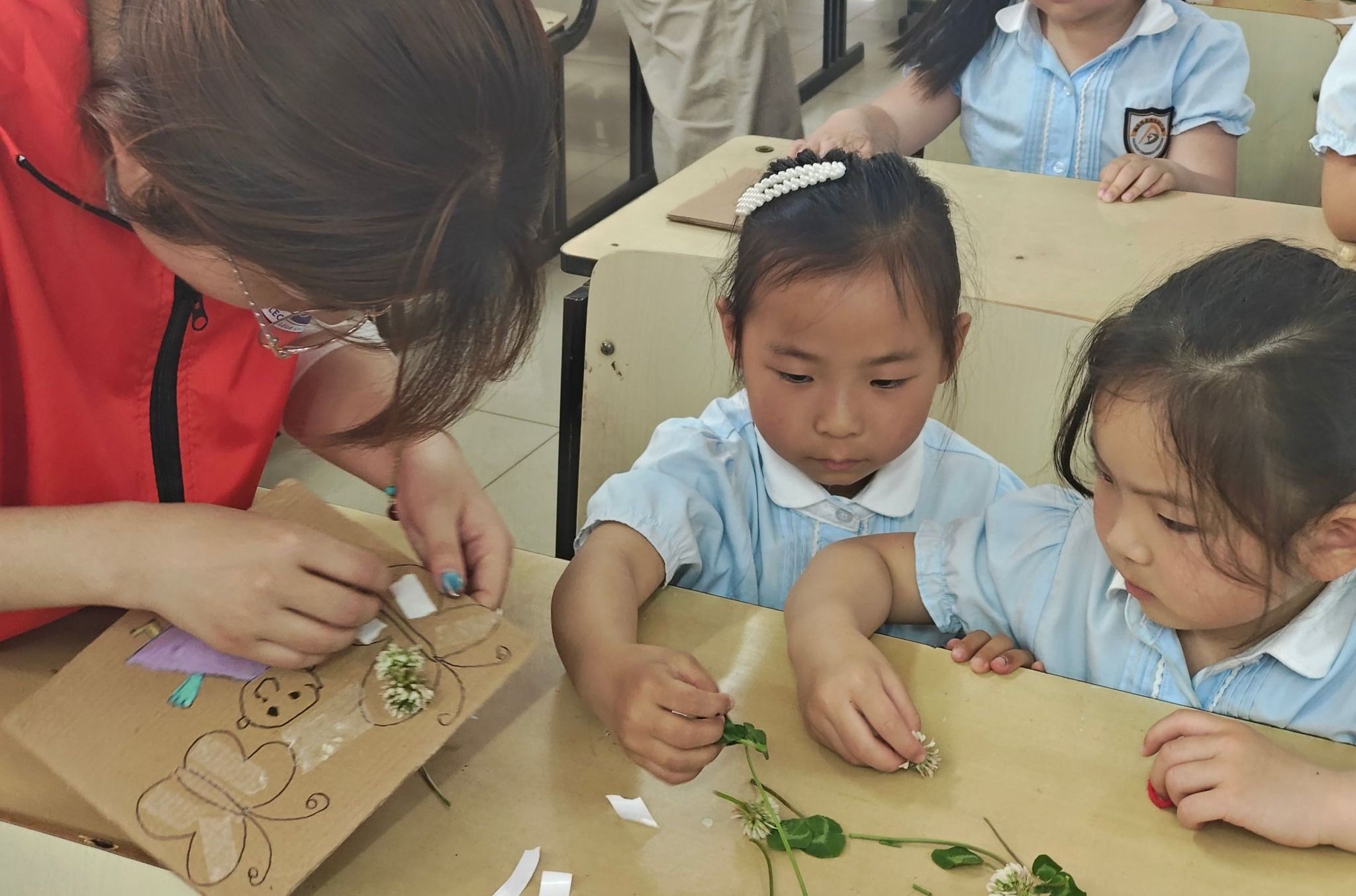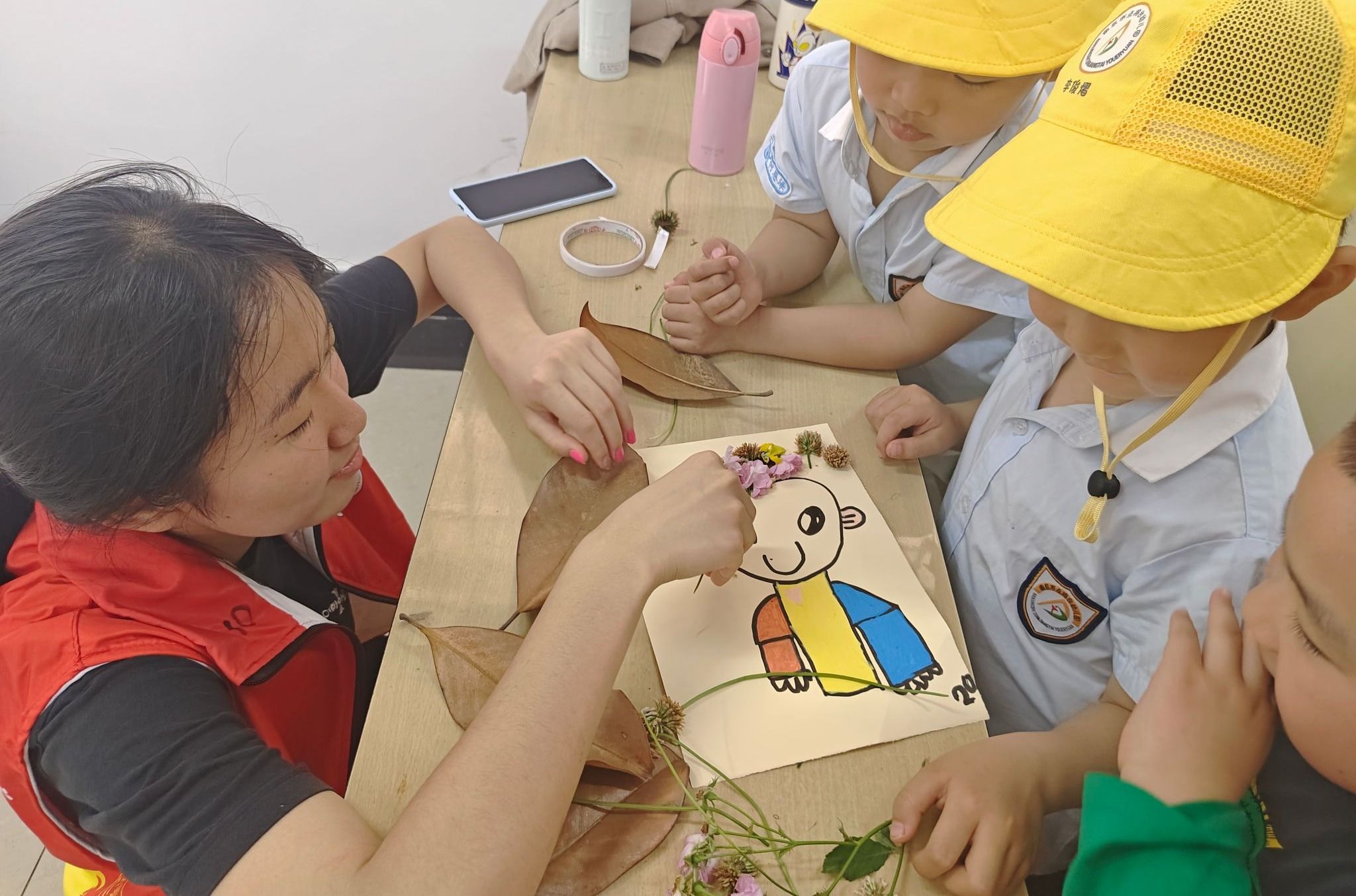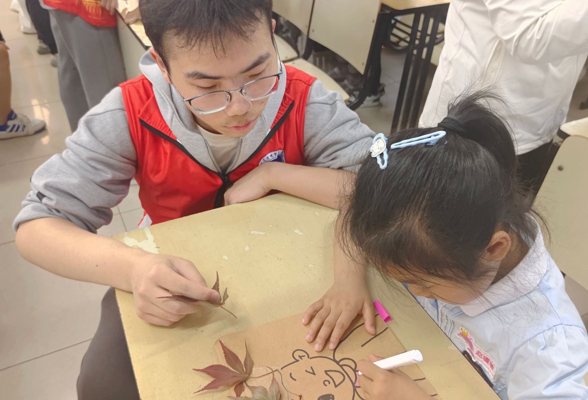 沿着梧桐成荫的校园步道,孩子们化身为“自然小侦探”。志愿者们蹲下身子,引导孩子们用童真的视角发现自然之美。半小时的自然采集后,汇贤楼B311教室变身创意工坊。志愿者们精心准备的《植物造型手册》激发了孩子们的创作热情。随后,小朋友们充分发挥想象力,在带有卡通人物的硬纸片上,利用收集到的树叶和花朵,为卡通人物设计出独一无二的“发型”。志愿者们则在一旁耐心协助,适时给予鼓励和指导。活动现场,孩子们举着作品进行“红毯秀”,童言稚语与欢笑声此起彼伏。