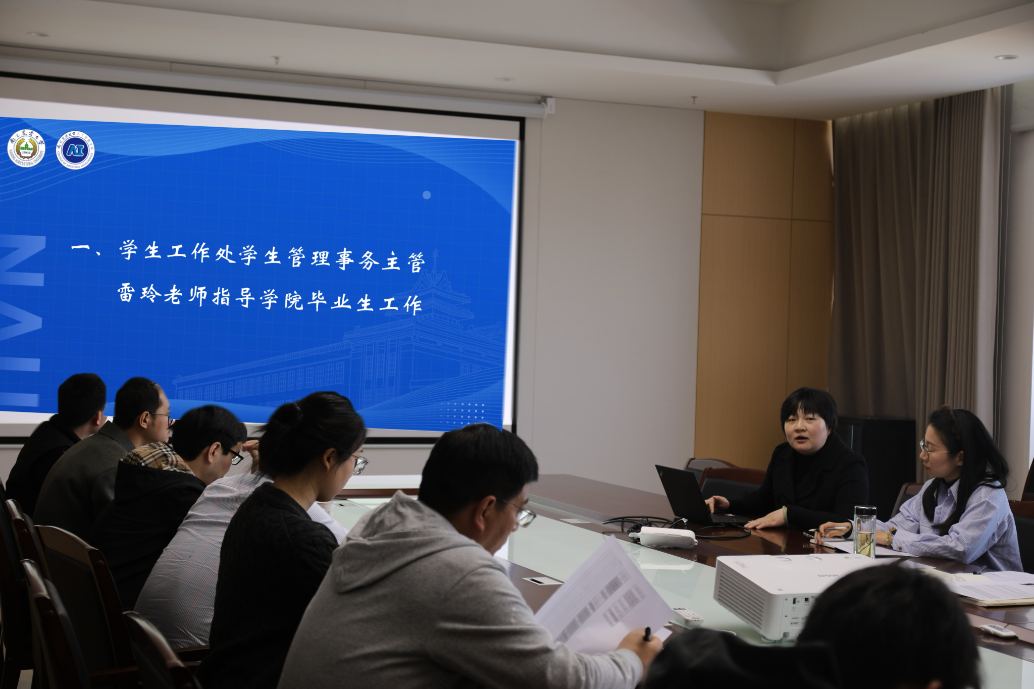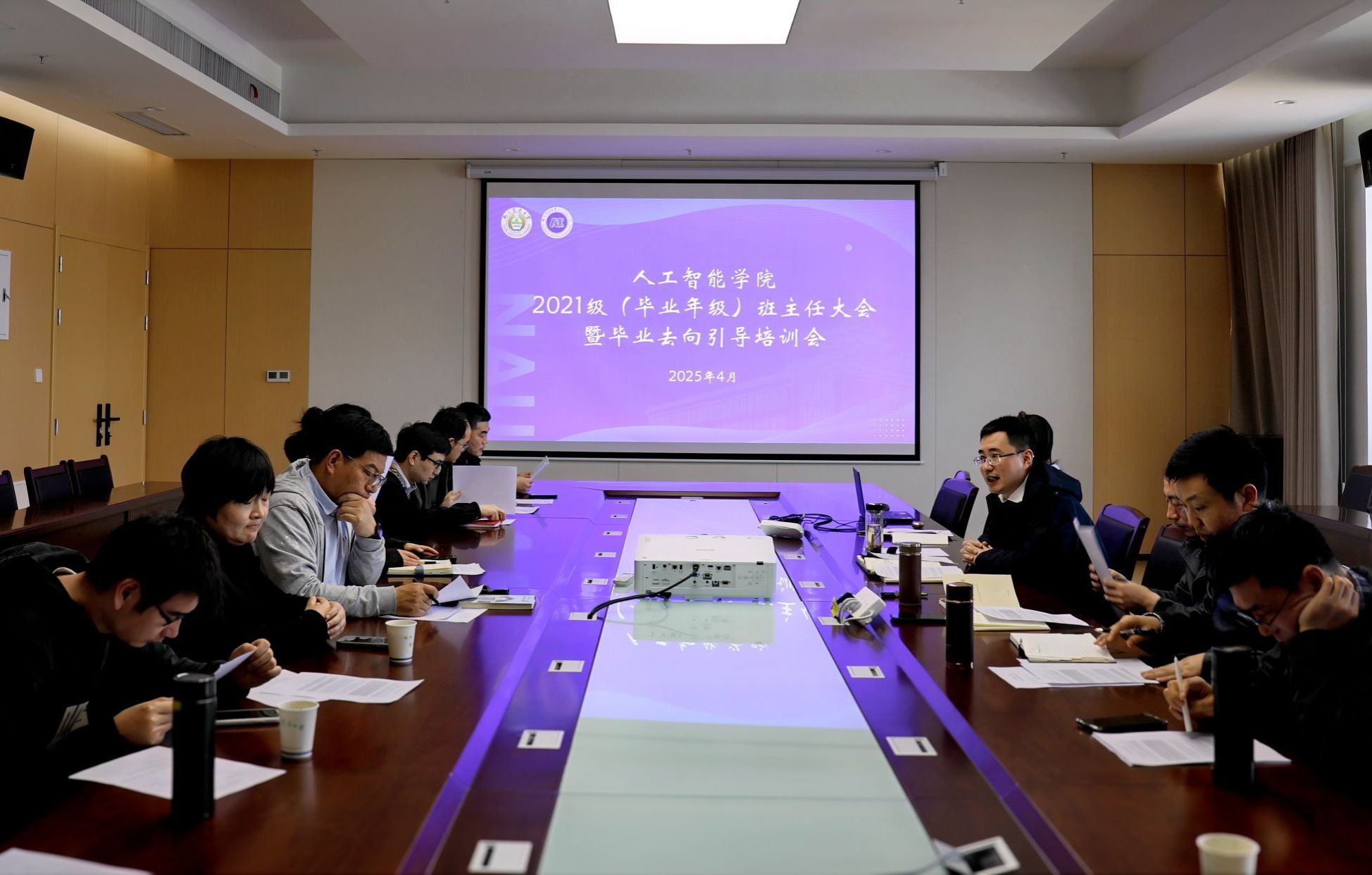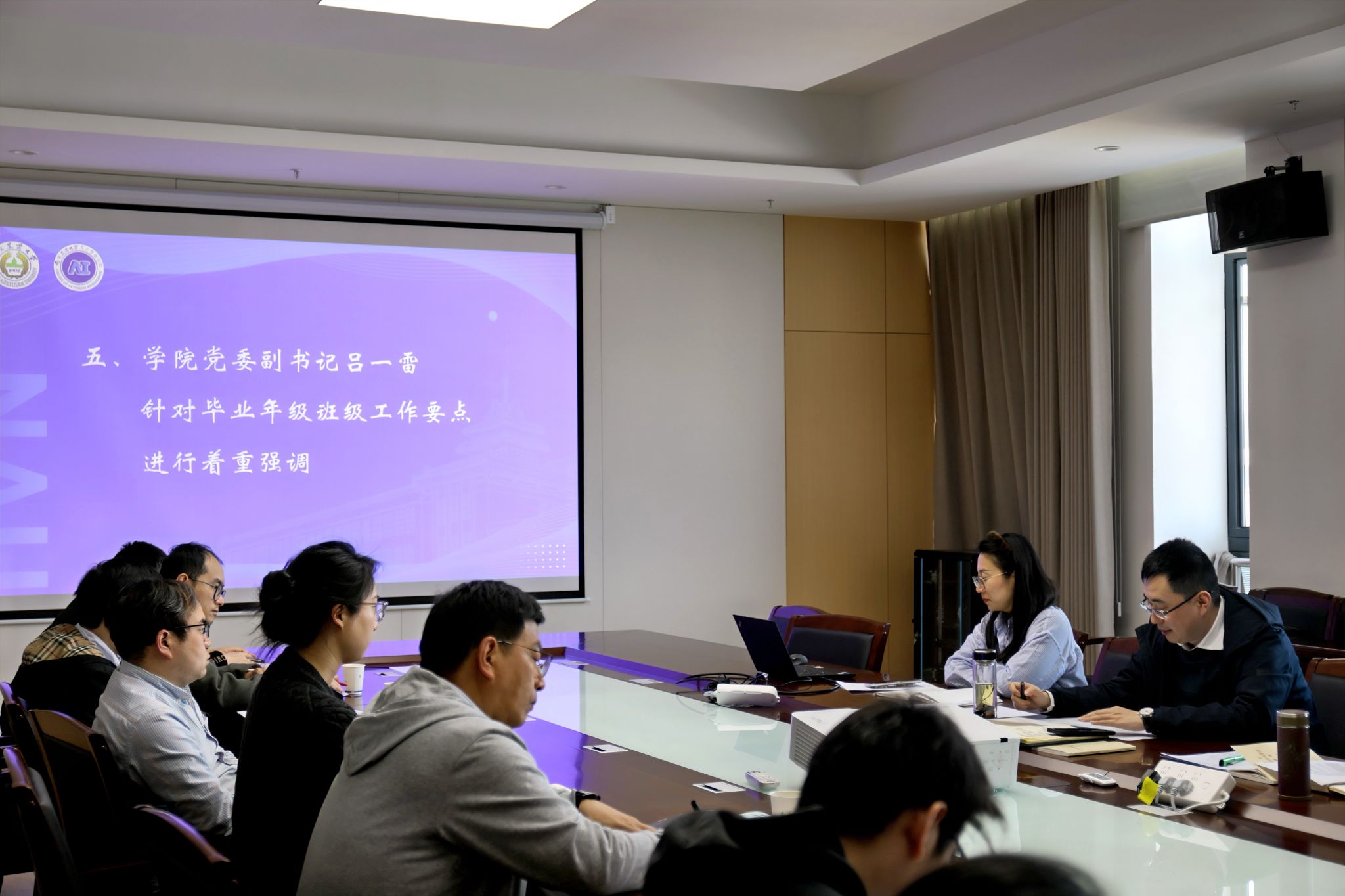 在滨江校区12号楼A863会议室召开2025届毕业班班主任培训会暨就业工作推进会。学院党委书记田永超、党委副书记吕一雷出席会议,特邀校学生工作处学生管理事务主管雷玲作专题指导,优秀班主任代表徐大华及全体毕业班班主任、辅导员参会。会议由吕一雷主持。