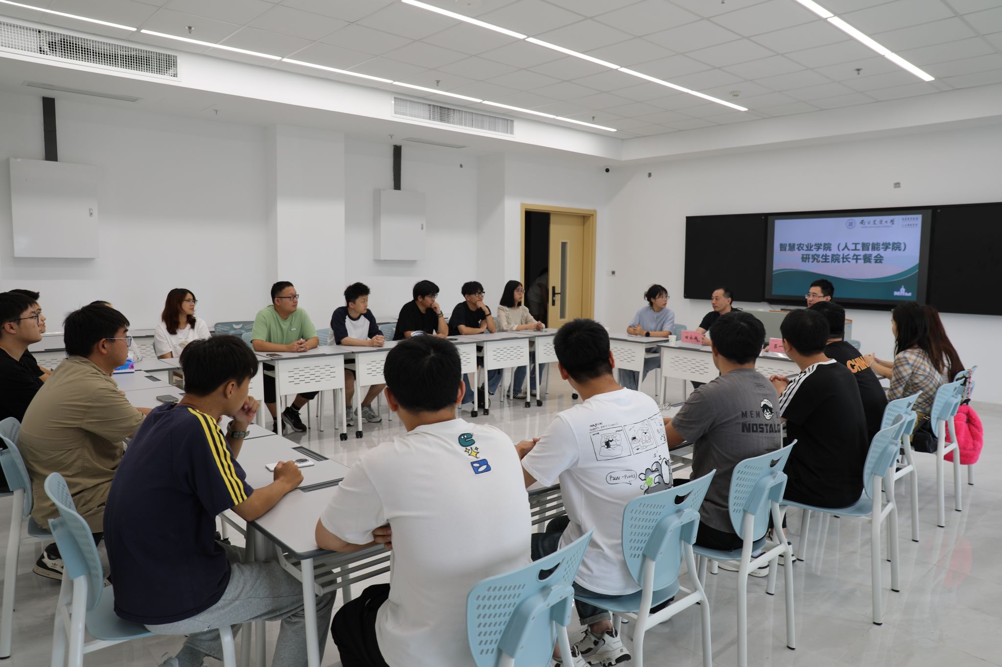 自由交流环节气氛热烈,同学们围绕科研发展与职业规划等话题踊跃提问。院长结合自身科研经验为大家指点迷津,并勉励大家打破学科壁垒,加强交流互鉴是激发创新灵感的关键。吕书记则表示,学院将密切关注同学们的各项需求,积极回应关切,为大家在新阶段的学习生活保驾护航。