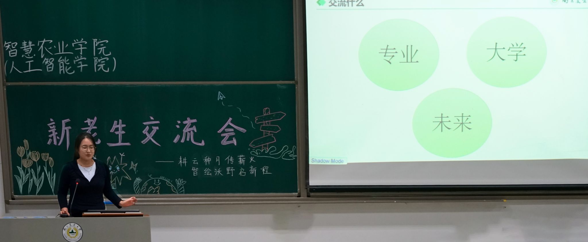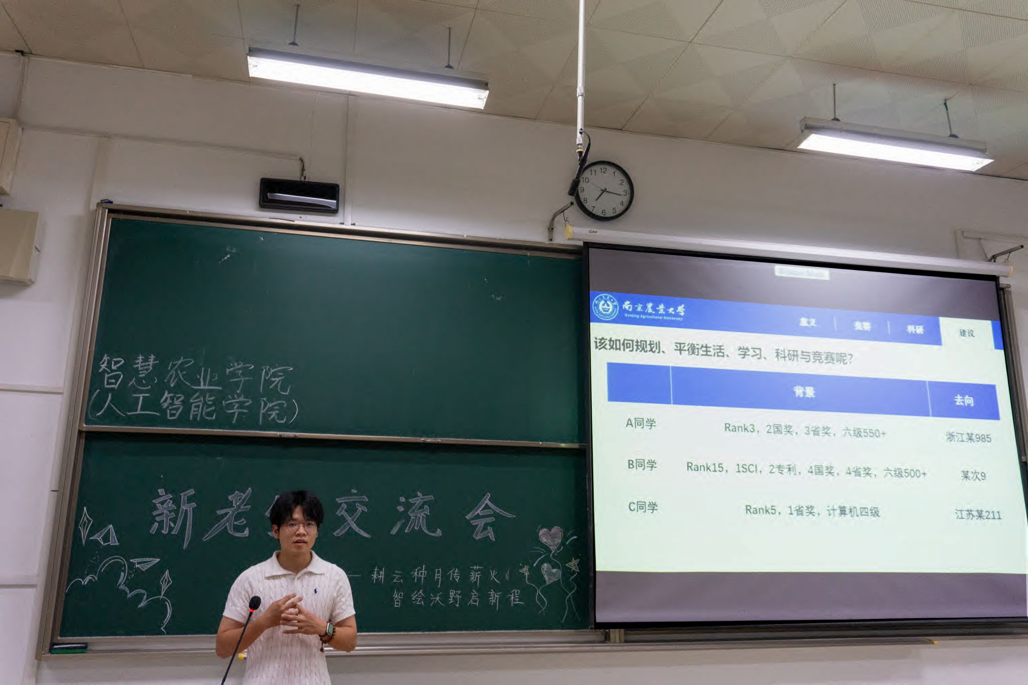 在计算机系与智慧农业系分会场,主讲人围绕“成长路径与未来规划”展开多维分享。计科221班林小词结合在学生组织及社团的经历,生动介绍了各类学生组织的职能定位与特色活动,引导新生根据兴趣特长选择合适的发展平台;数据232班舒新宇以“科研入门”为主题,分享了从专业文献阅读、确定研究方向到联系导师的实用技巧,为有科研意向的新生指明了方向;人工智能231班李想系统解析了学科竞赛的备赛流程与关键技巧,通过自身参赛经历明晰核心能力要求,激发了同学们的创新意识与竞赛热情;智慧农业221班刘义轩对比分析了升学深造与就业求职的不同准备路径,强调“目标导向”的重要性,其总结的“早规划,早行动,未来才更从容”理念引发全场新生强烈共鸣。