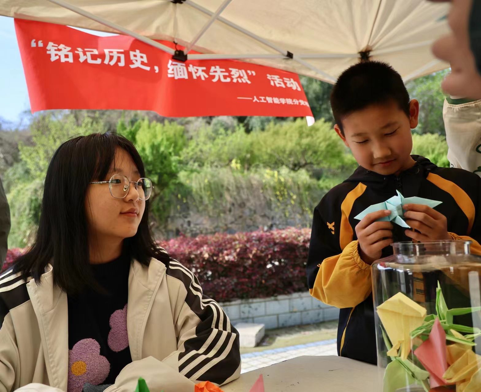 活动现场,一场缅怀诗会拉开帷幕,大家纷纷以诗颂情,诵读声触动在场每个人的心灵。也有同学巧手生花,将一张张彩纸折成鹤、菊,以鹤诉情,折菊寄思,缅怀英烈志,共筑中华魂。与此同时,线上渠道的学习通平台活动也在进行,同学们通过观看视频、答题,深入了解清明节的文化与习俗,感受传统文化的魅力,更感受到先烈英勇无畏的崇高精神。大家以文抒情,致敬革命英雄、缅怀革命先烈、学习革命先辈。