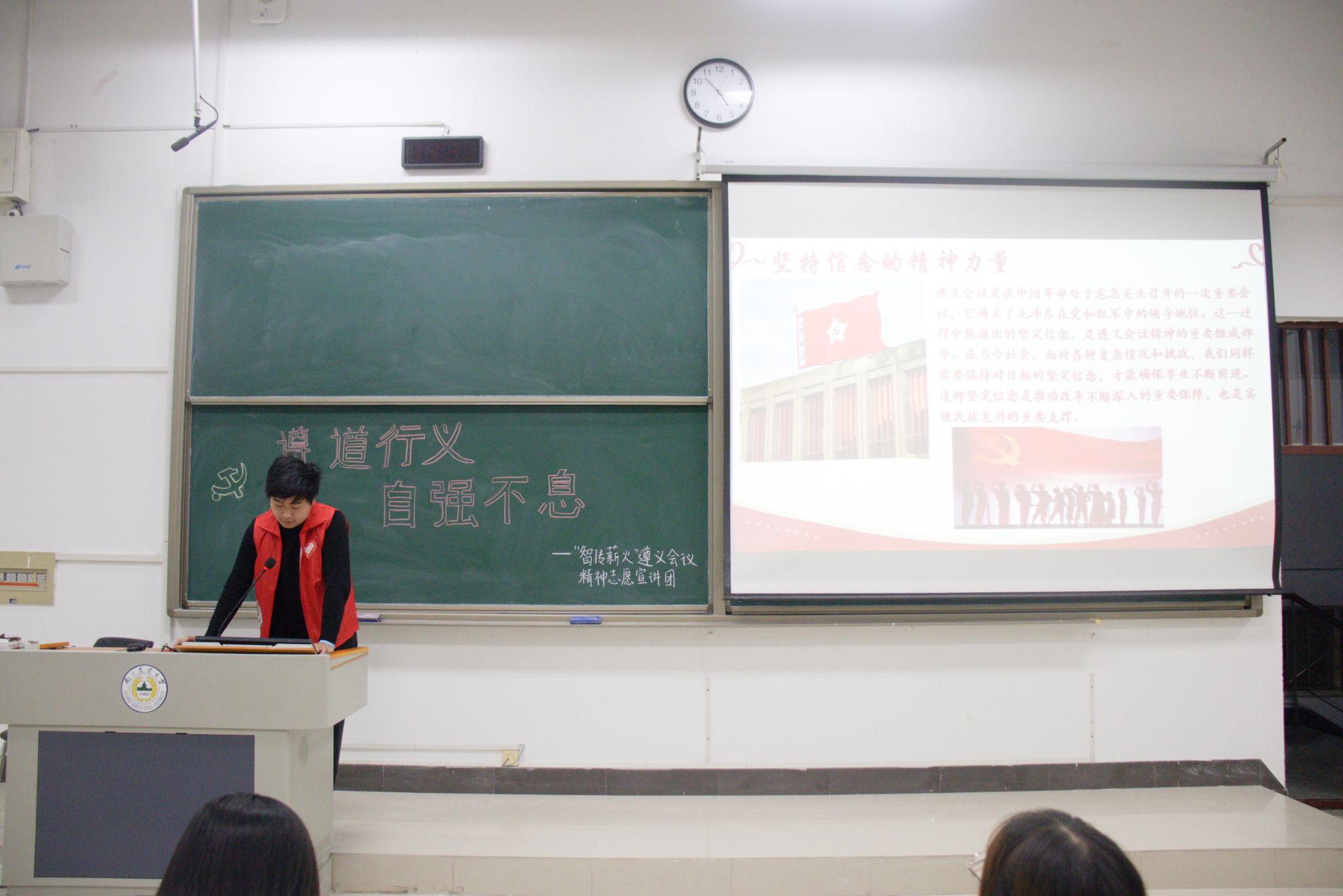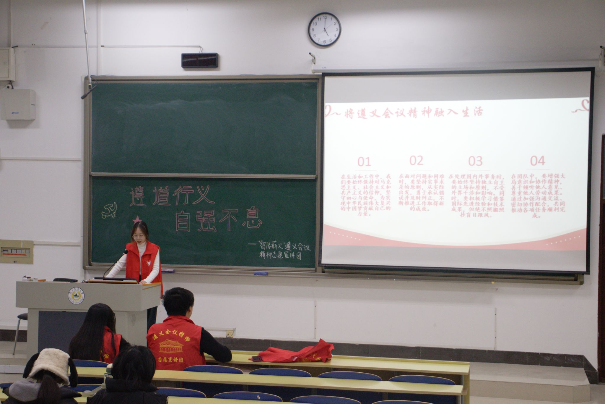 “智传薪火”志愿宣讲团在浦口校区博远楼举办了遵义会议精神宣讲活动。本次活动以“遵道行义,自强不息”为主题,旨在引导青年学子深入学习贯彻遵义会议精神,激发爱党爱国热情,学院100余名本科生参与活动。