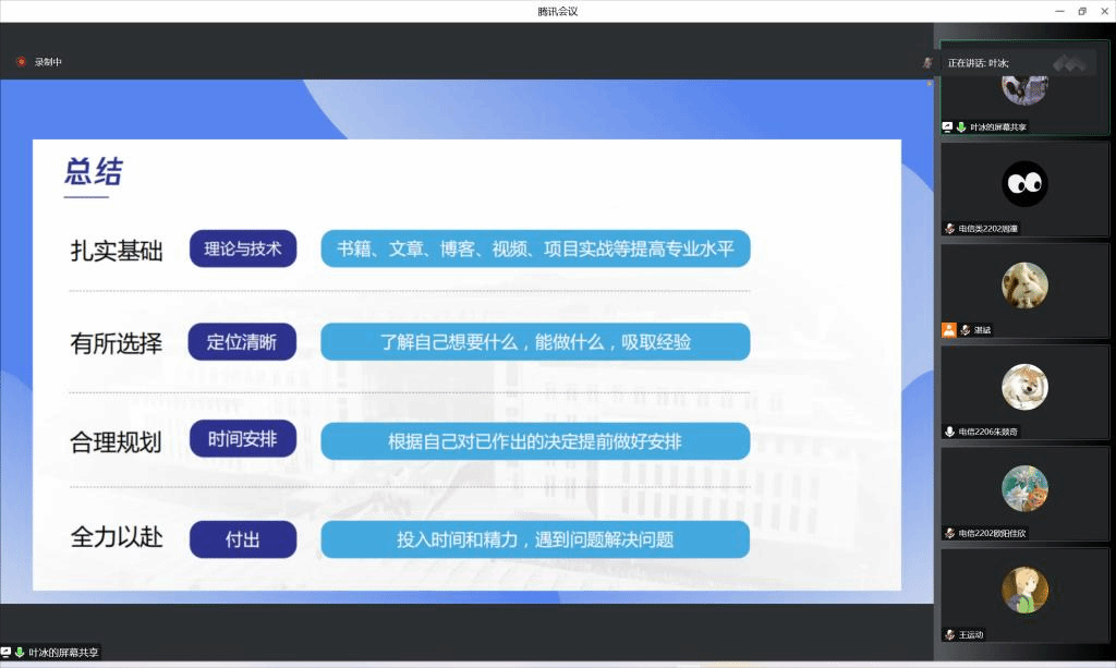 举办2022级新生入学系列讲座之——大学生涯规划专题讲座。本次讲座由毕业于北京大学、现优课达集团CEO、优课达教育联合创始人、前阿里巴巴技术专家叶冰主讲,学院学工办副主任湛斌主持,新生辅导员李洪、全体2022级新生线上参与此次讲座。
