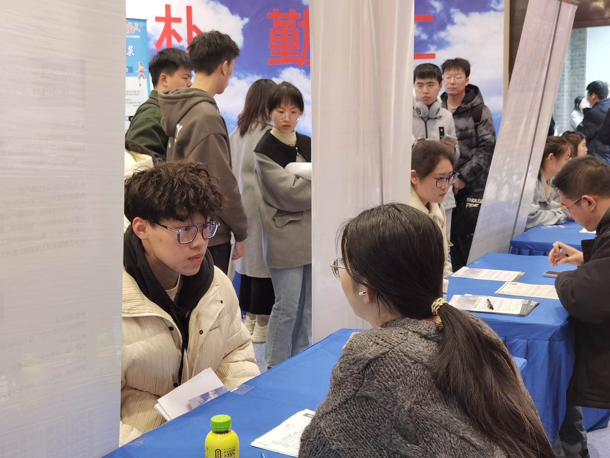 初春的寒潮与冷雨难以阻挡火热的求职氛围,招聘会现场人潮涌动,企业招聘人员与投递学生进行逐一互动交流。