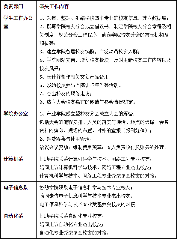 校友分会筹备工作主要分为四个阶段,即筹备启动阶段、梳理联络重点走访阶段、架构组建广泛宣传阶段、组织召开成立大会阶段。各阶段进度安排及主要工作任务详见下表: